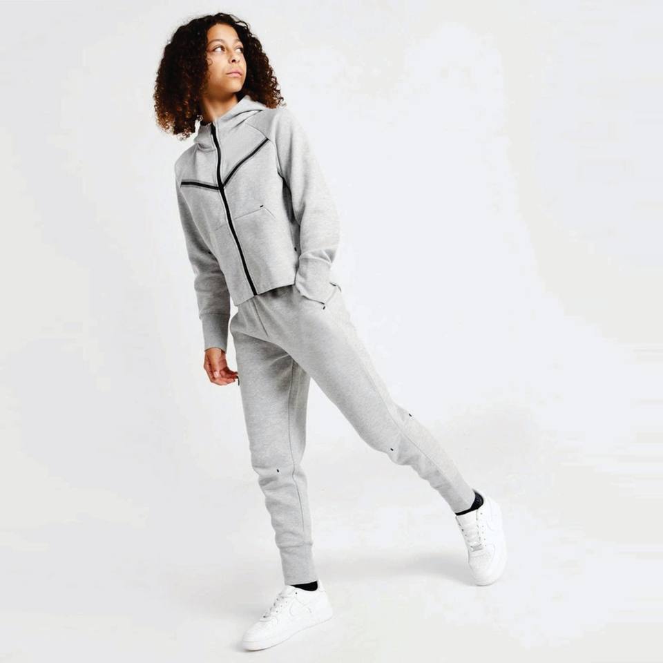 ชุดวอร์มกางเกงผ้าฟลีซสำหรับเด็กผู้หญิงผ้าคอตตอน31% 69% มีฮู้ดผ้าโพลีเอสเตอร์สีเทามีซิปแบรนด์ออกแบบโลโก้ได้ตามต้องการ