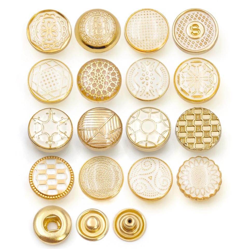 กระดุมโลหะผสมสังกะสีแบบสแนปสำหรับเสื้ออาบายะห์ โธบ และเสื้อผ้าอื่นๆ พร้อมโลโก้แบรนด์ตามสั่ง ชุบเคลือบอย่างดี อุปกรณ์ตกแต่งเสื้อผ้า