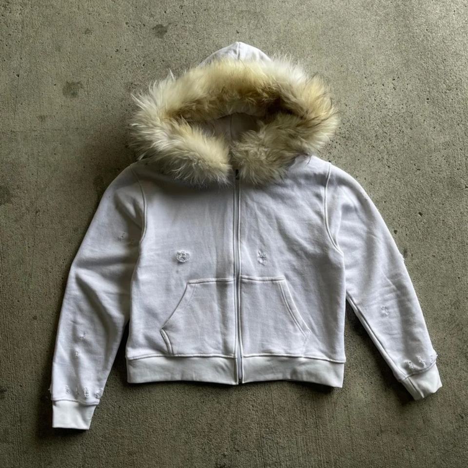 เสื้อฮู้ดดี้ผ้าฝ้ายคุณภาพสูงแบบมีซิป แต่งขนเฟอร์เทียม ทรงโอเวอร์ไซส์ ขาดๆ แบบวินเทจ สกรีนโลโก้แบรนด์ตามสั่ง ขายส่ง