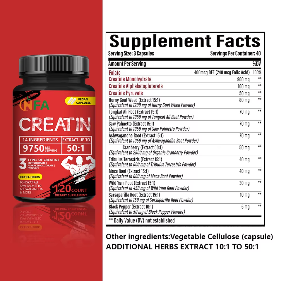 แคปซูลครีเอตินขนาด9750มก. พร้อมใบเลื่อยแอชวาแกนดาสำหรับฟื้นฟูกล้ามเนื้อผลิตภัณฑ์เสริมอาหาร