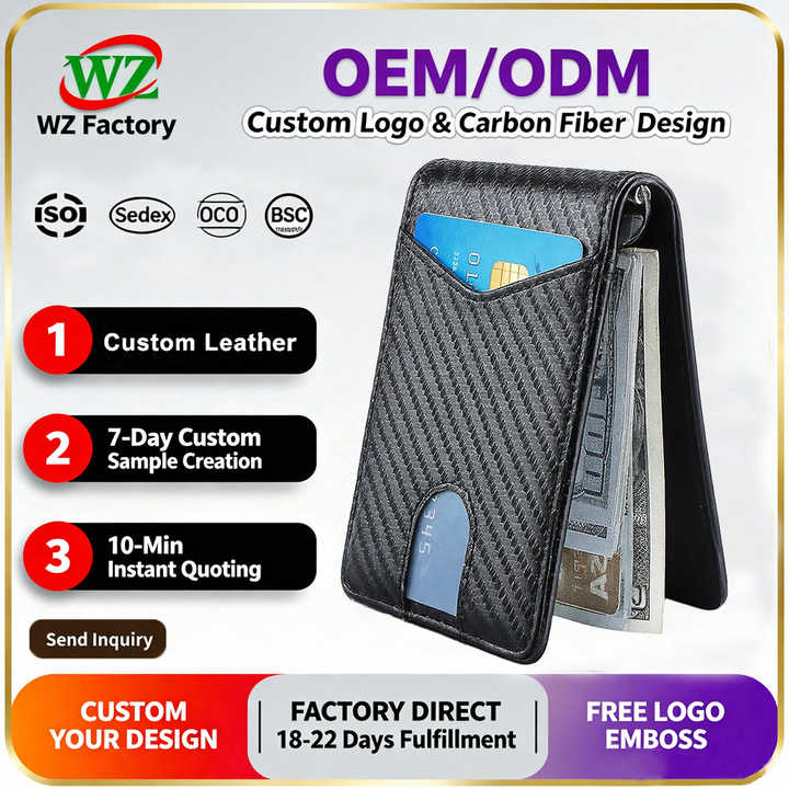 กระเป๋าสตางค์หนังแท้แบบพับสองตอน ดีไซน์มินิมอล ป้องกัน RFID พร้อมคลิปหนีบเงิน สำหรับผู้ชาย พิมพ์โลโก้แบรนด์ได้
