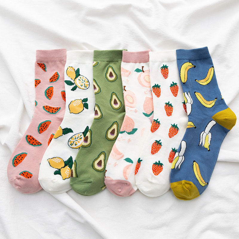 ถุงเท้าผ้าฝ้ายระบายอากาศออกแบบได้ตามต้องการถุงเท้ากีฬาด้านล่างพิมพ์ลายผลไม้สตรอเบอร์รี่อะโวคาโดกล้วยแตงโม