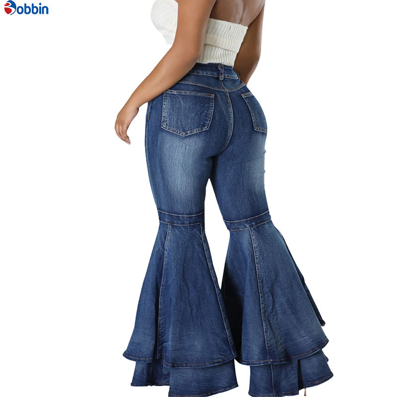 กางเกงยีนส์ขาบานเอวสูงลำลองของผู้หญิงกางเกงยีนส์ลำลองผู้หญิงแฟชั่นแนวสตรีทสูงระบายอากาศได้ตามต้องการ
