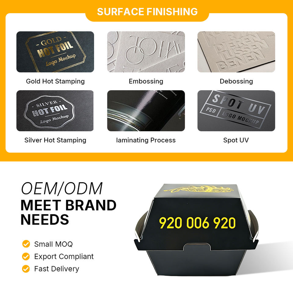 กล่องเบอร์เกอร์แบบกำหนดเอง E-Flute บรรจุภัณฑ์แฮมเบอร์เกอร์ กล่องกระดาษคราฟท์ ย่อยสลายได้ ลายนูน สำหรับเฟรนช์ฟรายส์ ไก่ทอด