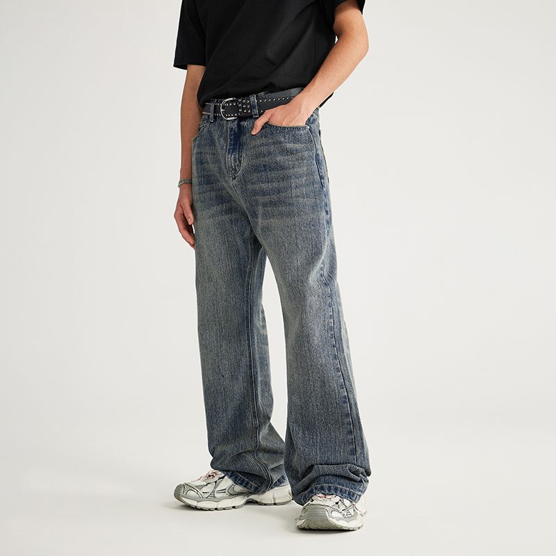 กางเกงยีนส์ขาตรงทรงสลิมฟิตมีกระดุมสีซีดสำหรับผู้ชายผู้หญิงกางเกงลำลองขนาดกลางขนาดใหญ่พิเศษดีไซน์แบบเรียงซ้อนกัน