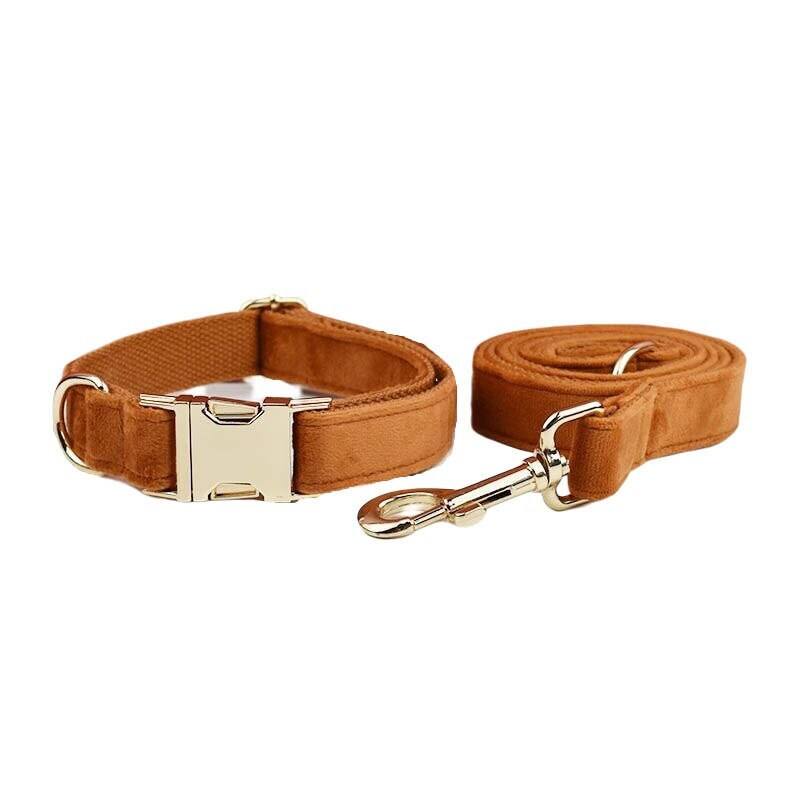 ปลอกคอสุนัขกำมะหยี่สีน้ำตาลคาเมลแบบกำหนดเอง พร้อมโบว์ผูกคอแบบเข้าชุด สายจูงรูปตัว H พร้อมถุงเก็บอุจจาระสุนัข ชุดแบบต่างๆ