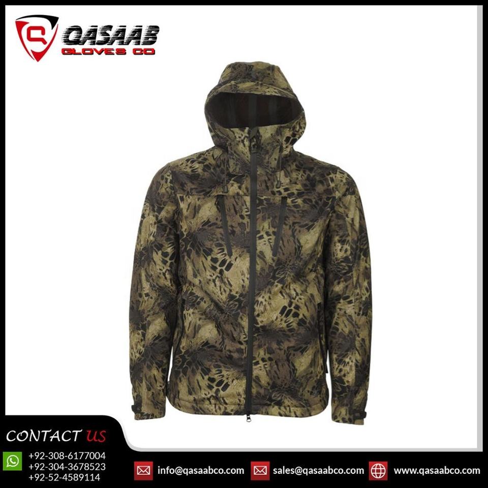 แจ็กเก็ตตกปลาล่าสัตว์พร้อมฮู้ดสำหรับผู้ชายระบายอากาศได้สำหรับตั้งแคมป์กันน้ำได้ดีไซน์ลายพรางออกแบบได้เอง