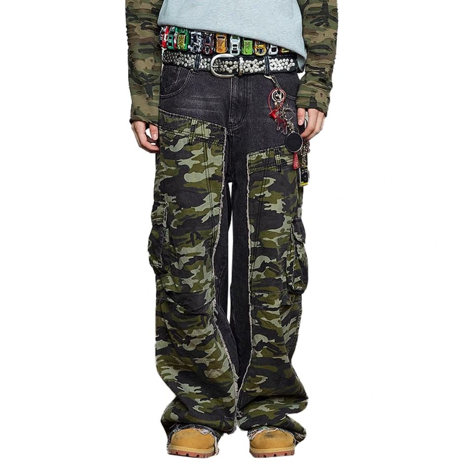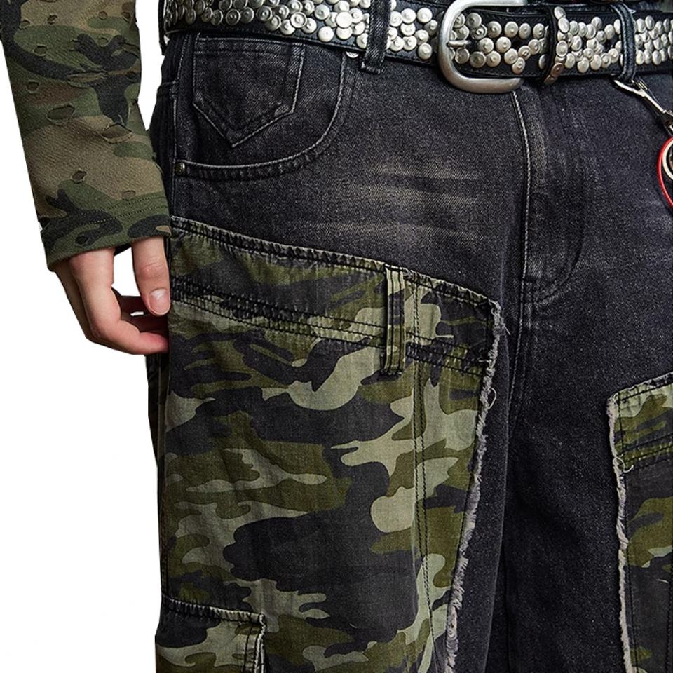 กางเกงยีนส์ทรงตรงหลวมสไตล์วินเทจลายพรางแบบดิสเทรส ขอบดิบ แต่งผ้าปะติด 100% ผ้าฝ้ายเดนิม สำหรับผู้ชาย สไตล์สตรีทแวร์ กางเกงคาร์โก้ลายพราง