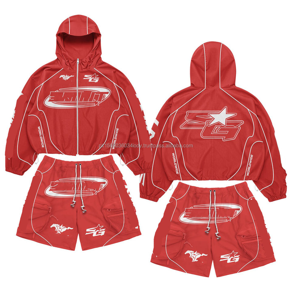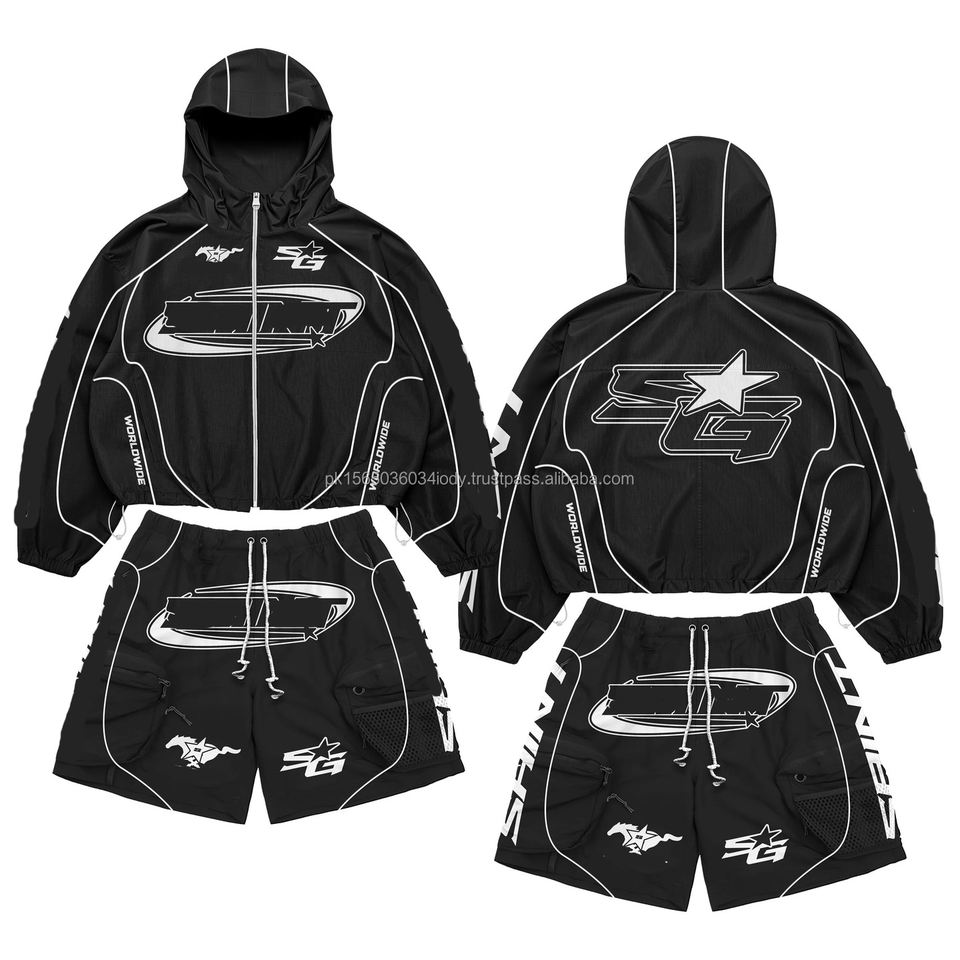 ชุดเซ็ตเสื้อแจ็คเก็ตครึ่งซิปผ้าโพลีเอสเตอร์ลายพรางแบบกำหนดเอง กางเกงจ็อกเกอร์ขาสั้น ชุดกีฬา 2 ชิ้น ชุดวอร์มผ้าไนลอนแบบต่อผ้า ชุดกันลมสำหรับผู้ชาย