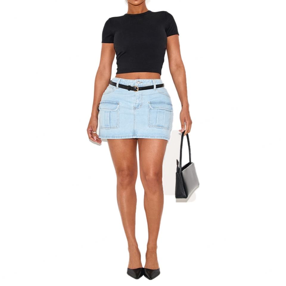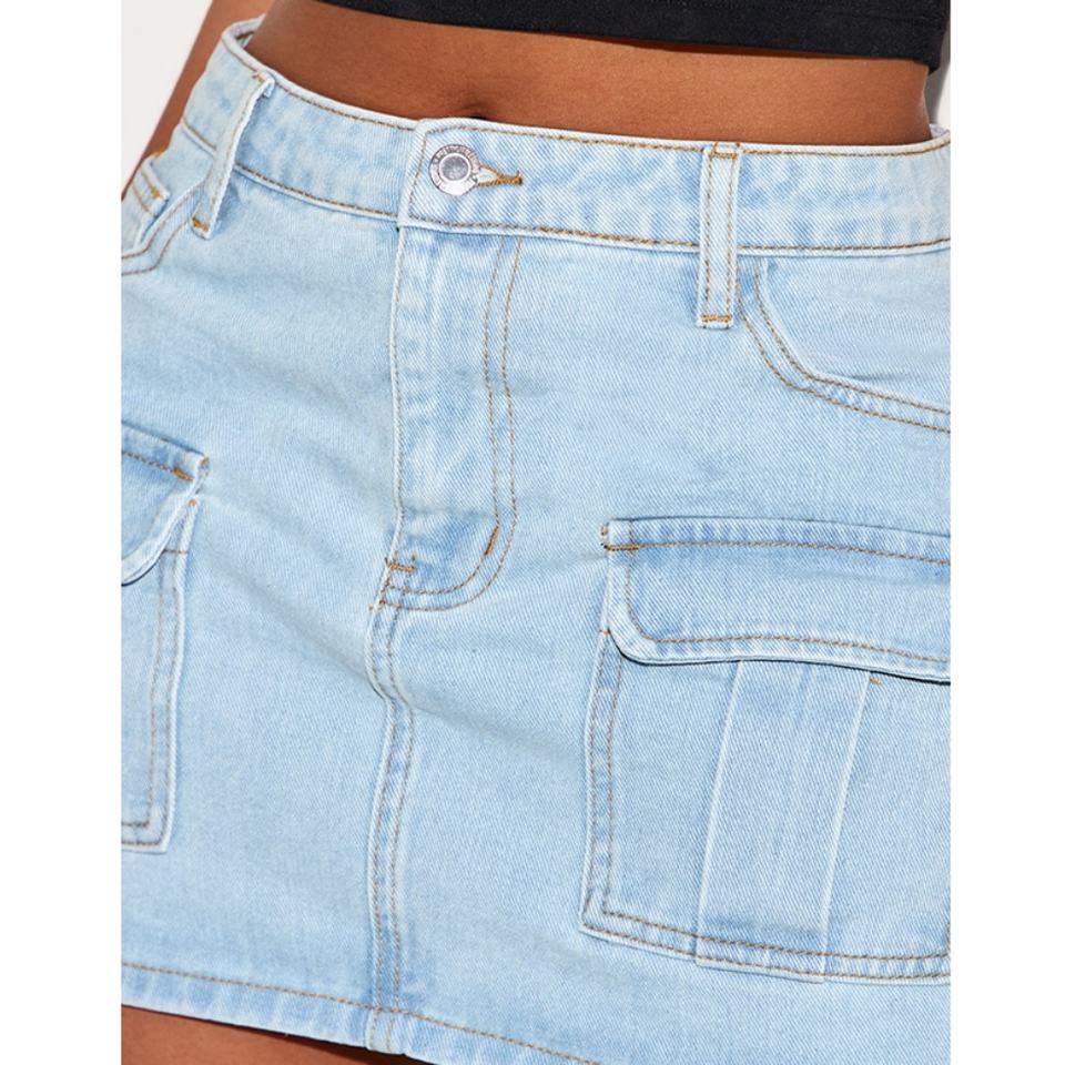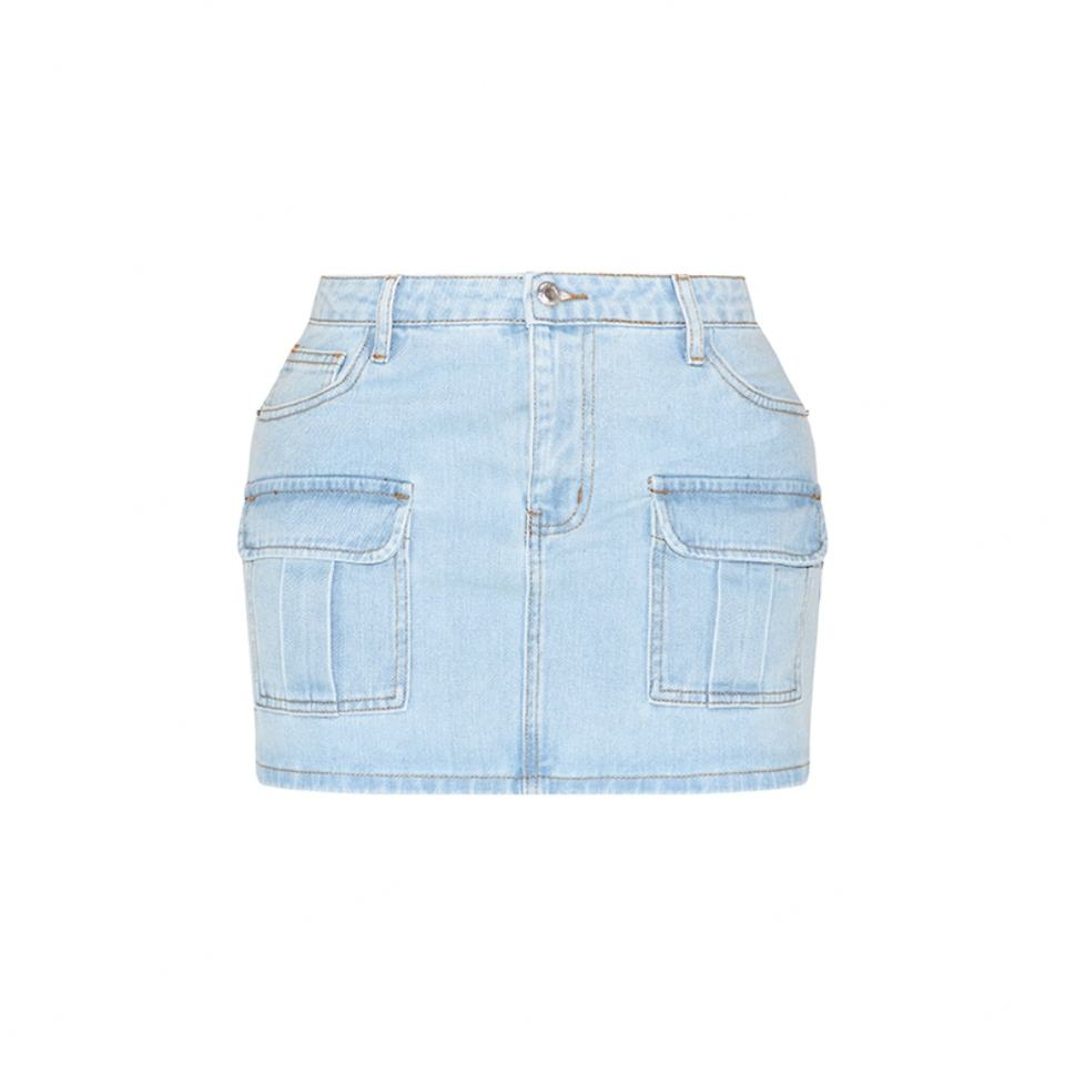 กระโปรงยีนส์คาร์โก้สั่งทำพิเศษสำหรับผู้หญิง ผ้าฝ้าย 100% สีฟ้าอ่อนวินเทจ ทรงเอวสูง มีกระเป๋าหลายช่อง กระโปรงสั้นผู้หญิง