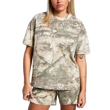ชุดเสื้อยืดลายพรางลำลองแบบกำหนดเอง ผ้ายืด/โพลีเอสเตอร์ ทรงปกติ แขนสั้น กางเกงขาสั้น ชุดเซ็ตสองชิ้นสำหรับผู้หญิง