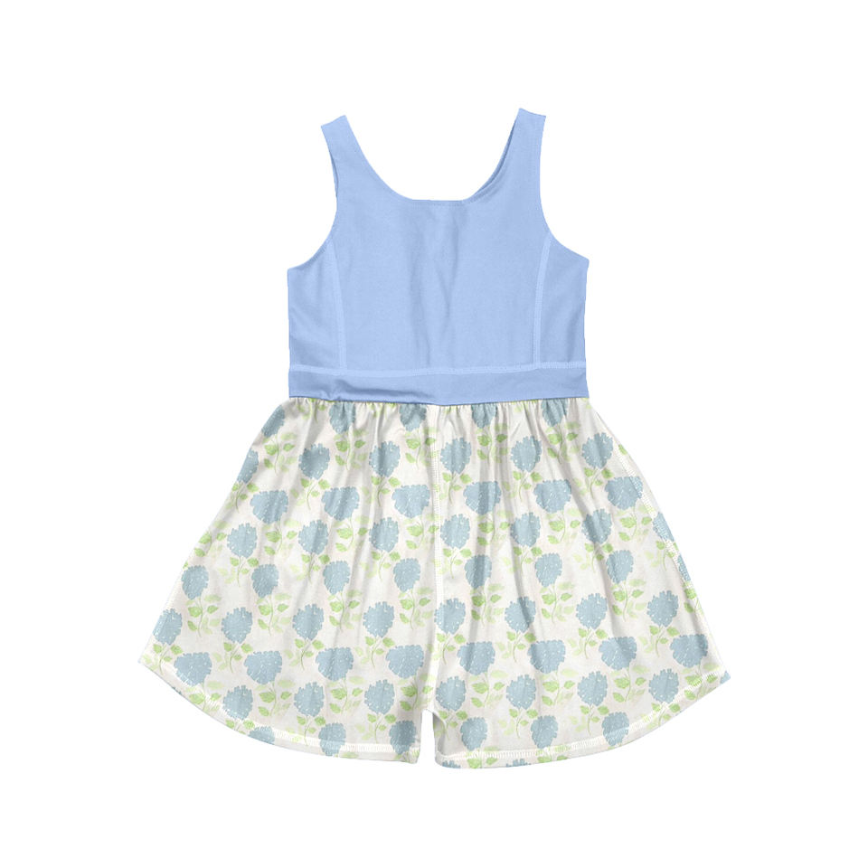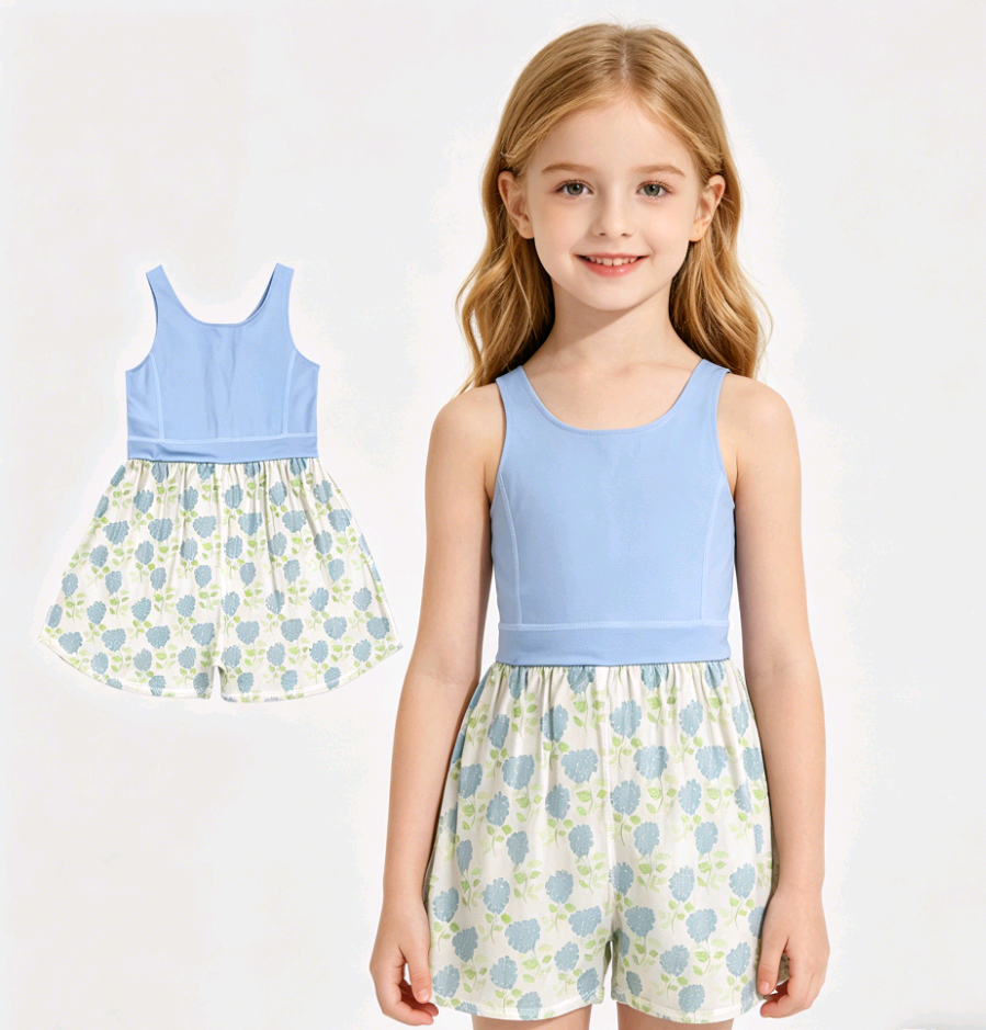 ชุดจั๊มสูทขาสั้นเด็กผ้าฝ้ายผสมสแปนเด็กซ์ลายดอกไฮเดรนเยียระบายอากาศได้ดีสำหรับฤดูร้อน ชุดบอดี้สูทเด็กทารก เสื้อผ้าพี่น้อง