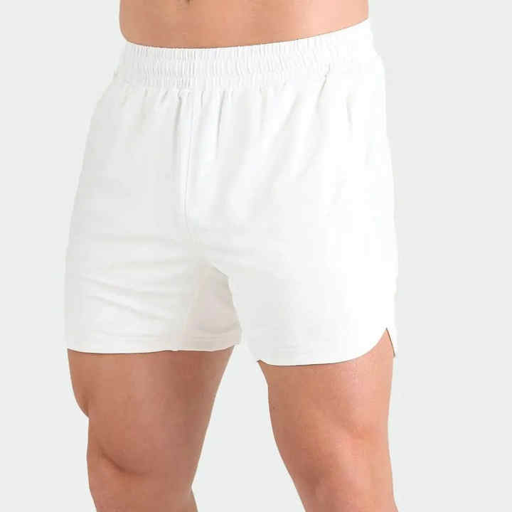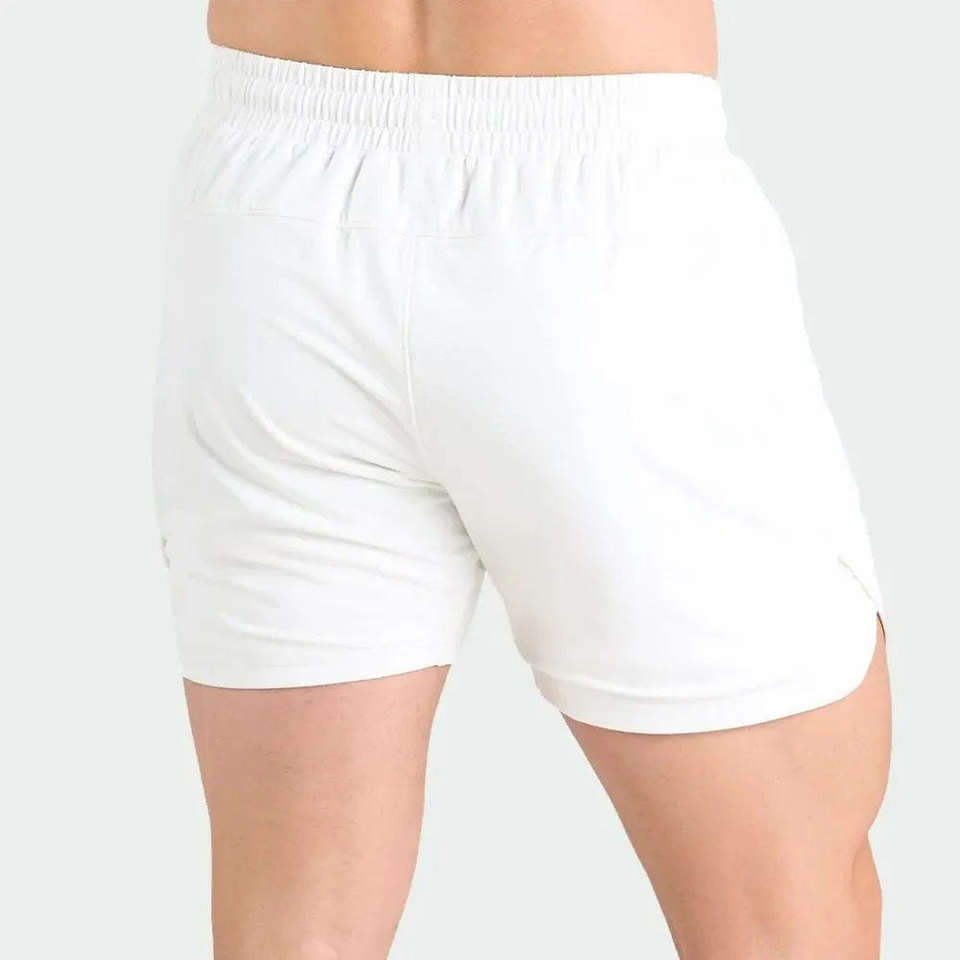 กางเกงขาสั้นลำลองผู้ชายผ้าวอร์สเตดแบบมีเชือกผูกเอว พิมพ์ลายโลโก้ด้านหน้า มีกระเป๋า กันยับ ปิดด้วยเชือกผูก ลายเรียบ