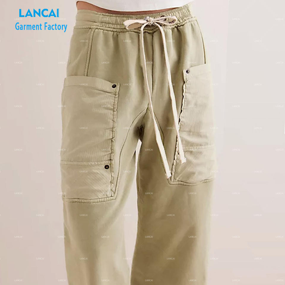 กางเกงขาตรงลำลองของผู้หญิงกางเกงผ้าฝ้ายกันลมมีกระเป๋าแบบเย็บติด