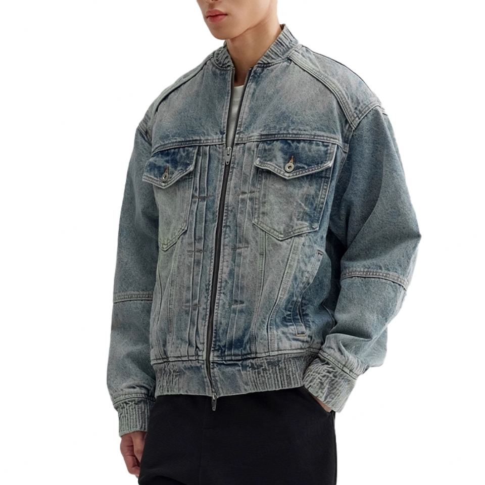 เสื้อโค้ทเดนิมสั้นทรงลำลองสำหรับผู้ชาย แต่งจีบสไตล์วินเทจสีน้ำเงินเข้ม ผ้าฝ้าย 100%