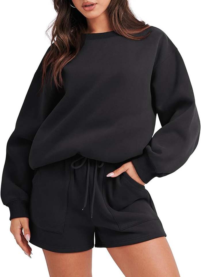 เสื้อสเวตเชิ้ตคอกลมสไตล์ฮิปฮอปสำหรับผู้หญิง ชุดเซ็ต 2 ชิ้น กางเกงขาสั้นผ้าฝ้ายสีพื้น สำหรับฤดูหนาว งานถัก ลายสกรีน