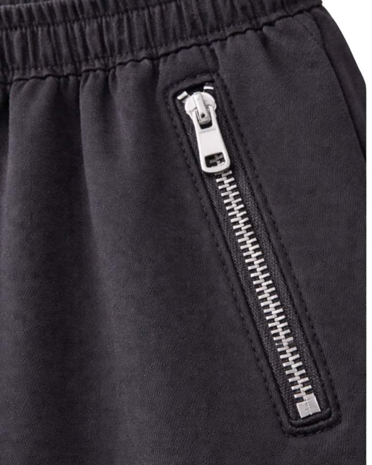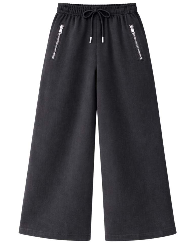 กางเกงวอร์มขาบานสีดำชาร์โคลแบบมีซิปสำหรับผู้หญิง เอวยางยืด ผ้าฟลีซ มีกระเป๋าซิป สไตล์ลำลอง สตรีทแวร์ กางเกงฤดูหนาว