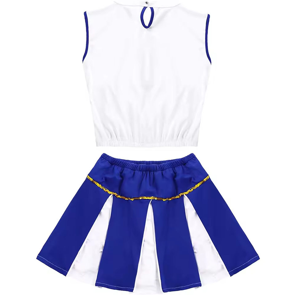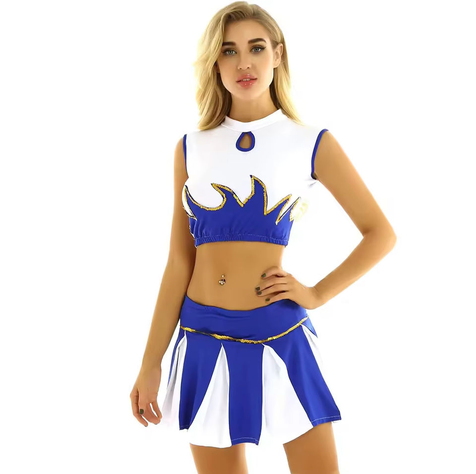 ชุดยูนิฟอร์มเชียร์ลีดเดอร์แบบกำหนดเอง เสื้อแขนกุด กระโปรงจีบ และชุดเต้นสำหรับผู้ใหญ่หญิง ทำจากโพลีเอสเตอร์
