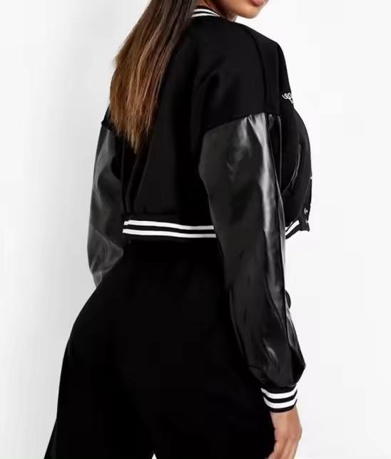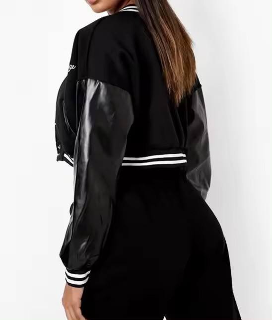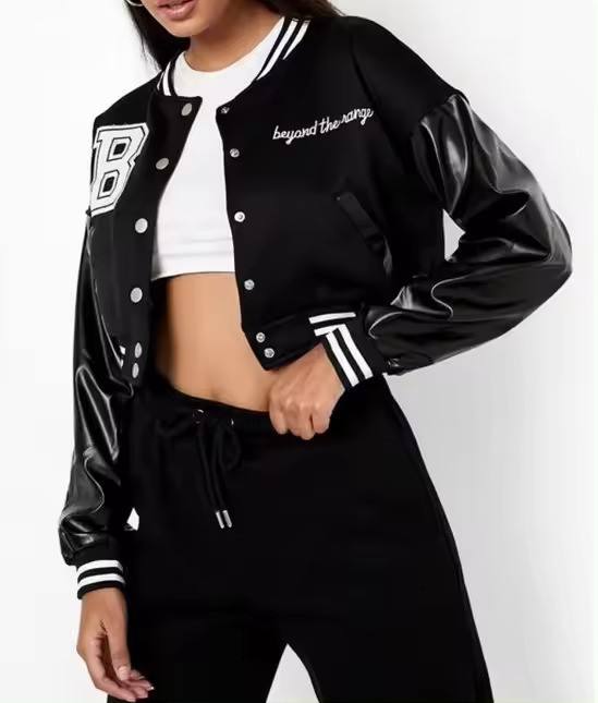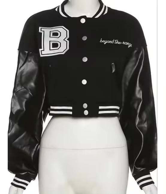 แจ็กเก็ตบอมเบอร์เบสบอลวิทยาลัยเสื้อครอปสำหรับผู้ชายปักผ้ากำมะหยี่ปกคอตั้งงานตามสั่ง