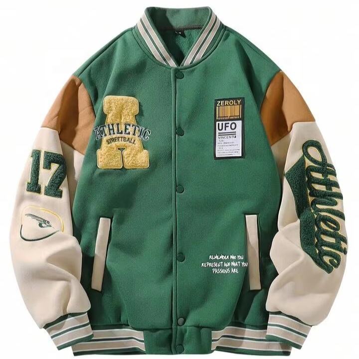 เสื้อแจ็กเก็ตขนสัตว์กำมะหยี่ปักลายสำหรับผู้ชายแขนเสื้อหนังสไตล์วิทยาลัยทันสมัยเสื้อแจ็คเก็ตกันหนาวอบอุ่นสำหรับผู้ชาย
