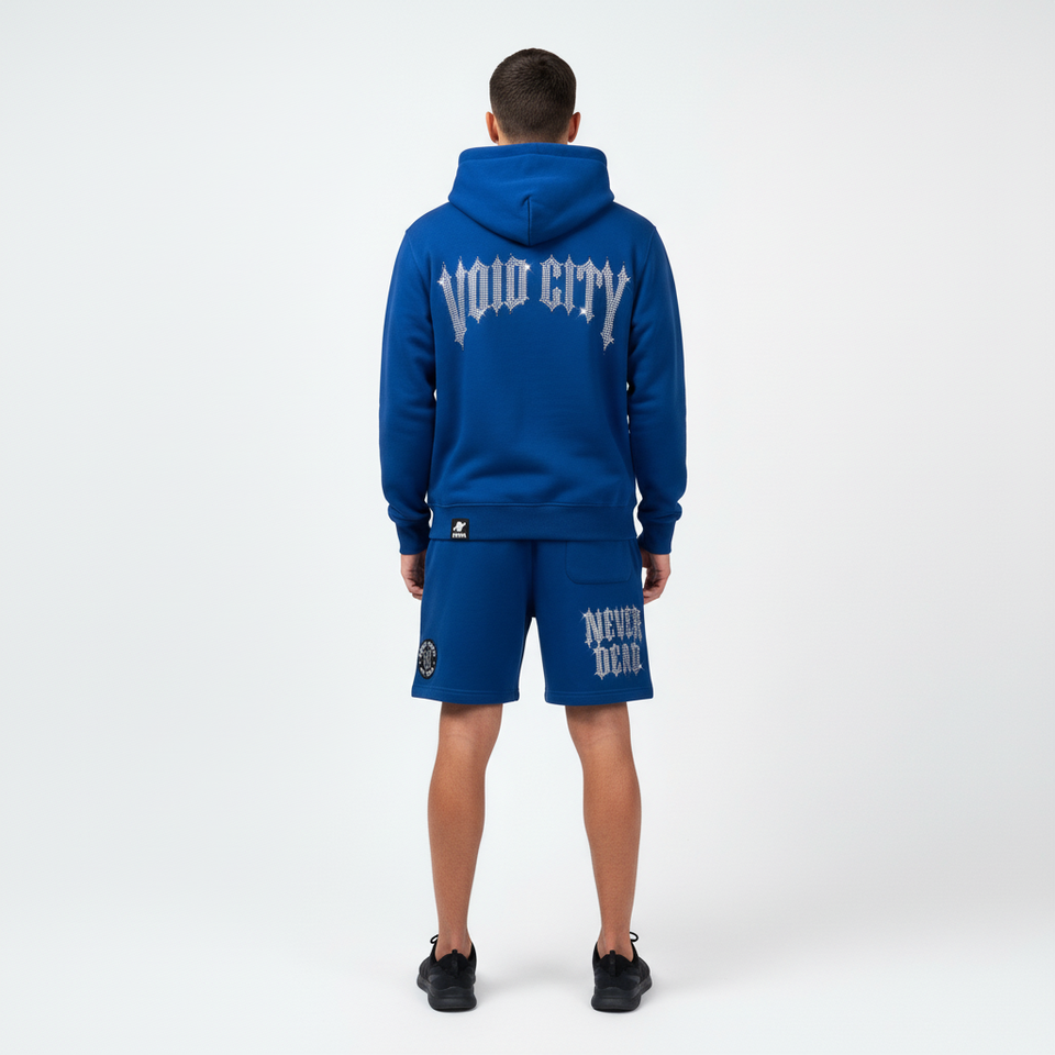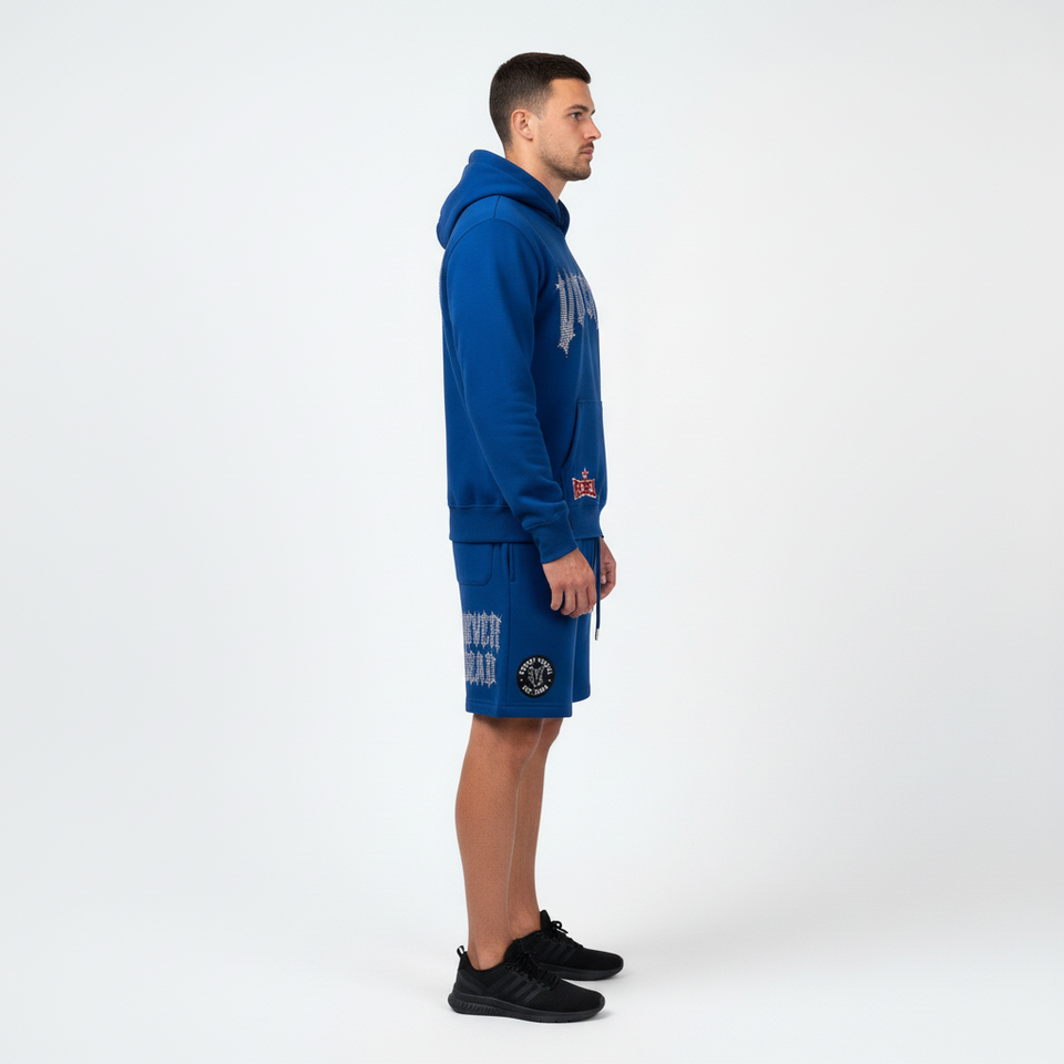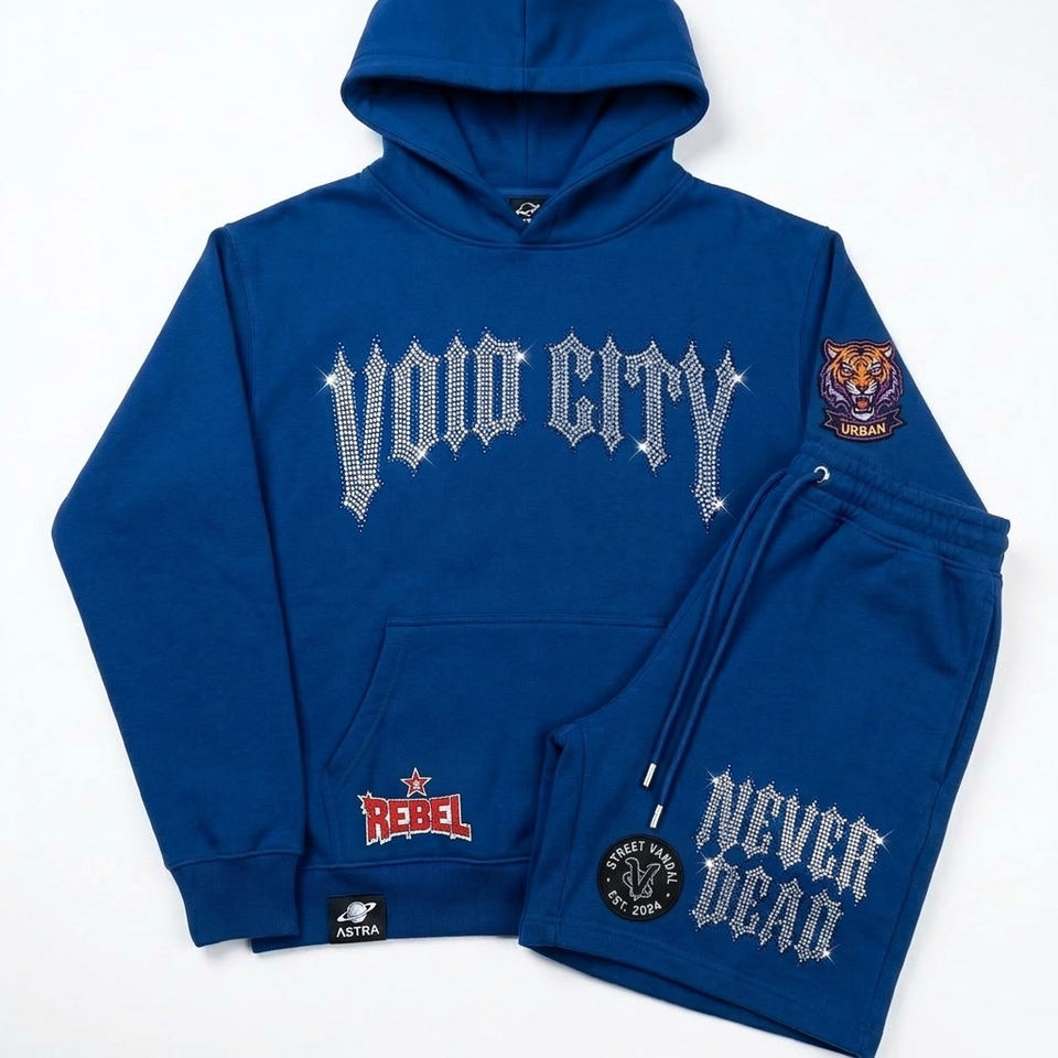 ชุดเสื้อผ้าออกแบบเองสำหรับผู้ชาย ชุดฮู้ดดี้ประดับเพชรและกางเกงขาสั้น ผู้ผลิตเสื้อผ้า