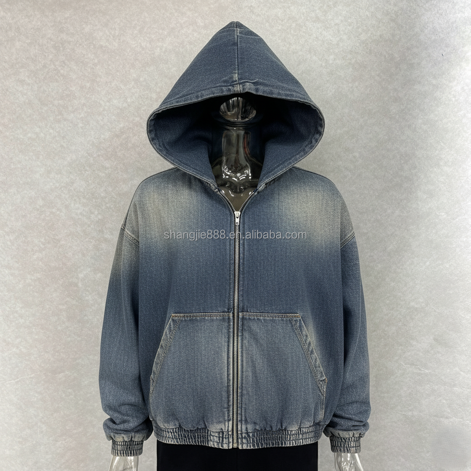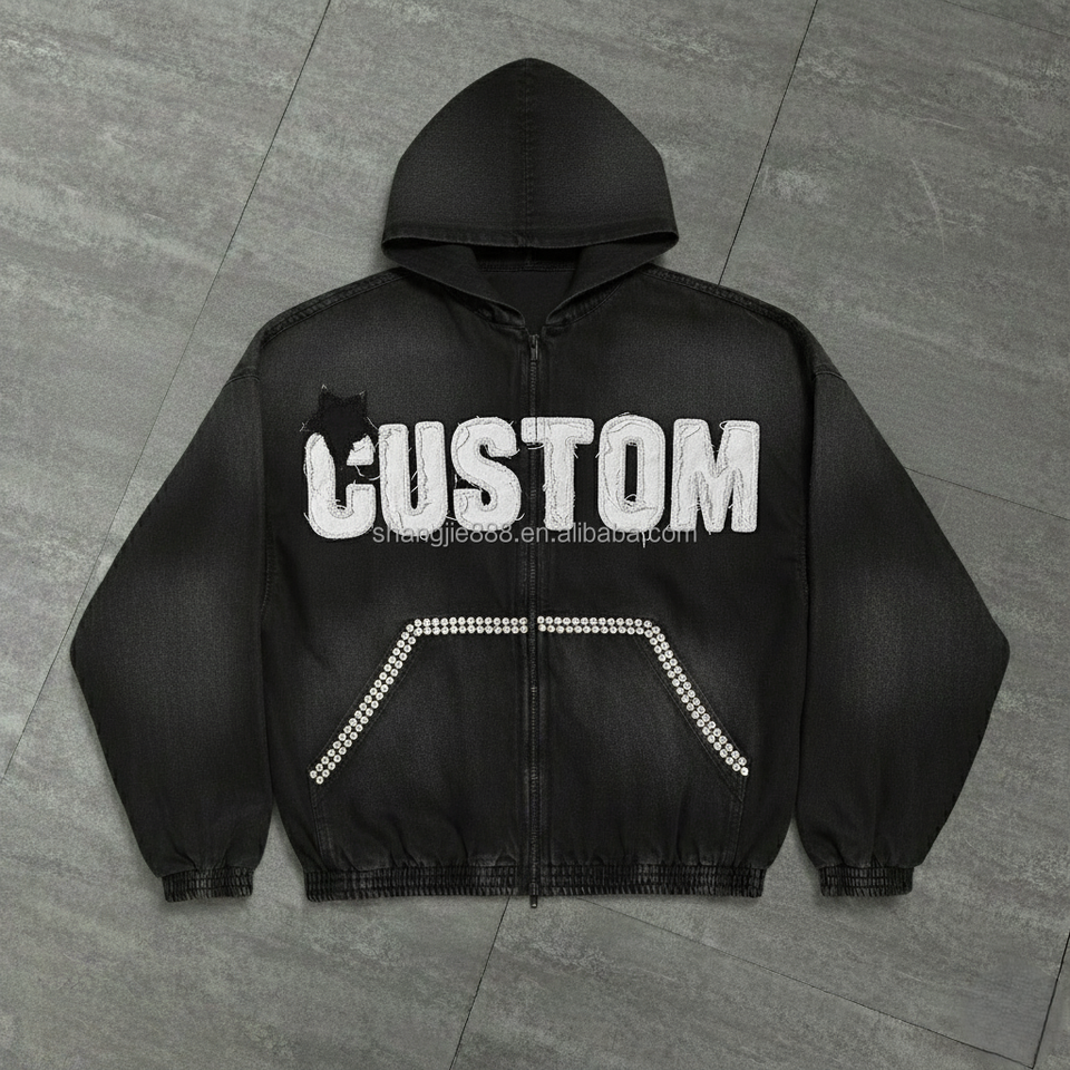 ผู้ผลิตเสื้อผ้าสั่งทำ เสื้อฮู้ดดี้ผ้าฝ้ายเฟรนช์เทอร์รี่เนื้อหนัก สไตล์วินเทจ ซันเฟด แอซิดวอช ปักลาย ประดับคริสตัล ผ้ายีนส์
