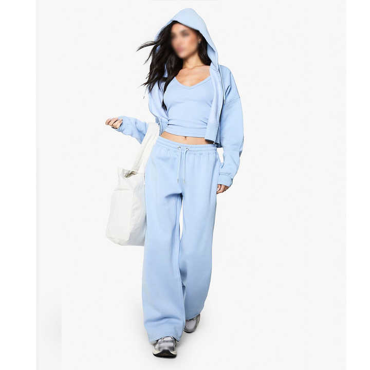ชุดเซ็ตเสื้อฮู้ดครอปซิปและกางเกงขายาวทรงกว้าง สไตล์สตรีทแวร์ ผ้าฝ้ายฟลีซ สำหรับผู้หญิง ขายส่ง
