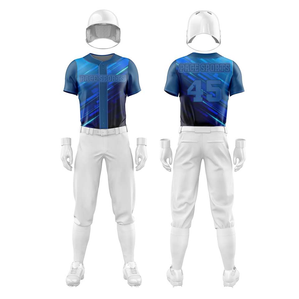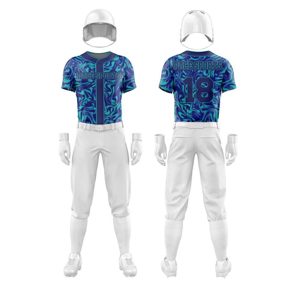 ชุดเสื้อเบสบอลแห้งเร็วแบบปรับแต่งได้ชุดเสื้อกีฬาโพลีเอสเตอร์ระบายอากาศสีดำและสีน้ำเงินพร้อมตัวเลขสำหรับทีมสโมสร