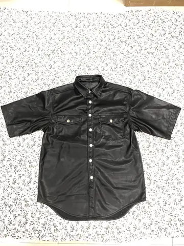 เสื้อยืดปกหนังแท้สำหรับผู้ชายสีดำแขนสั้นมีกระเป๋าติดกระดุมที่หน้าอกสำหรับฤดูใบไม้ร่วง