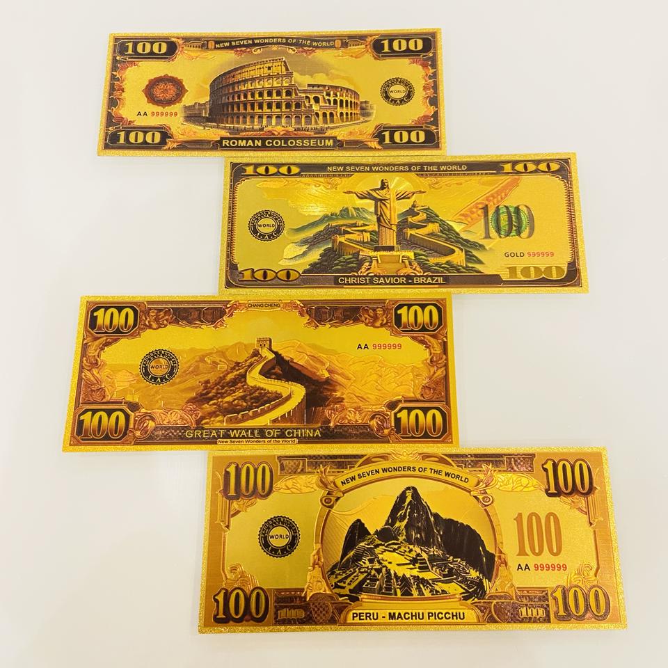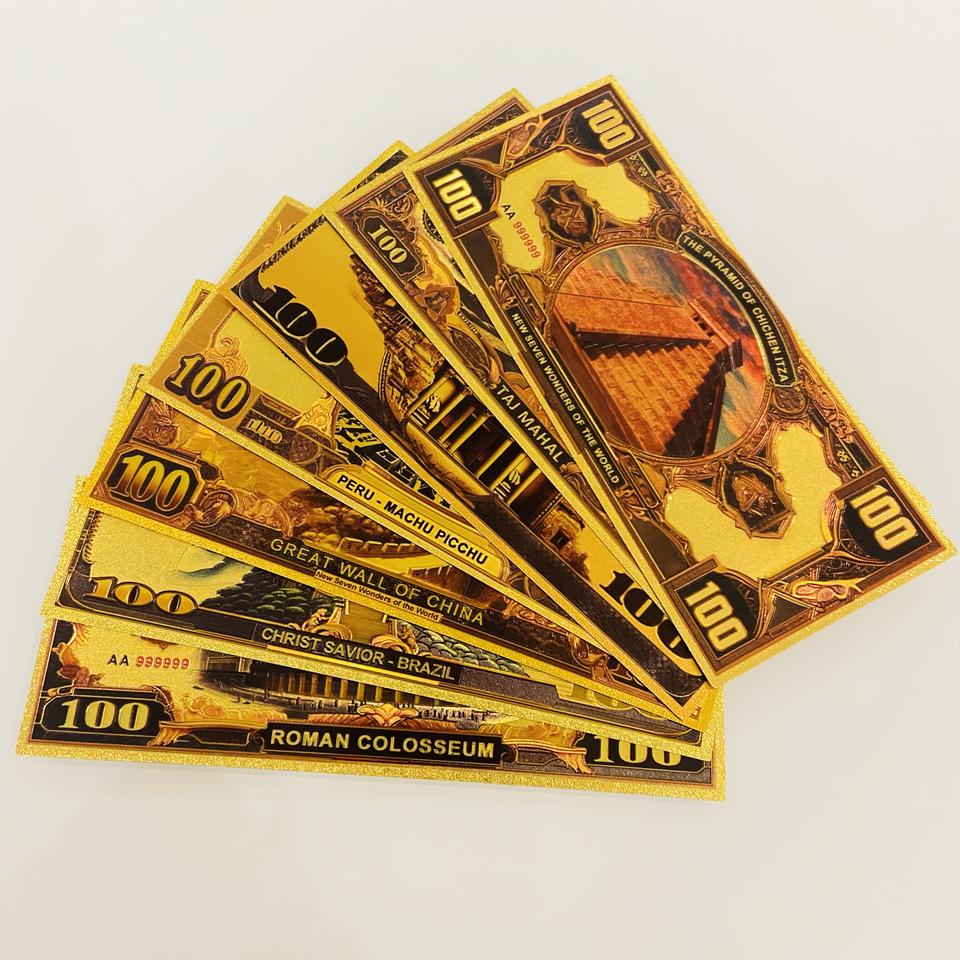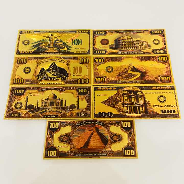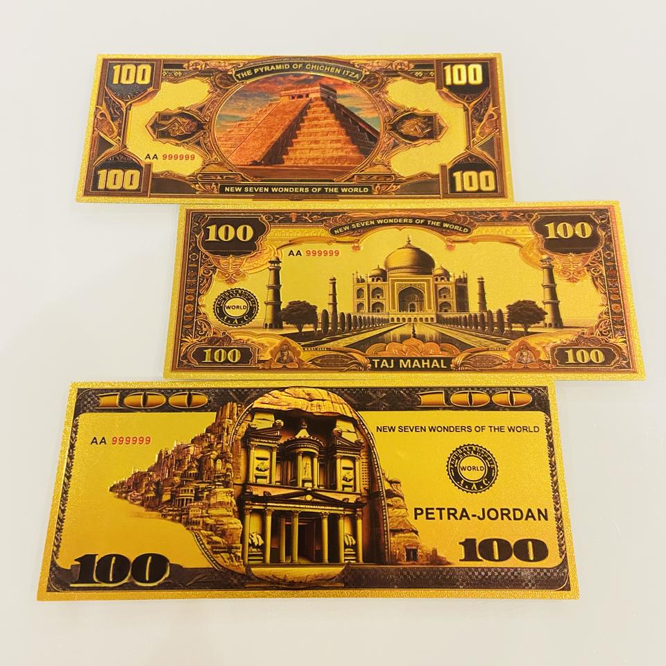ธนบัตรสะสมแบบกำหนดเอง ภาพจำลองเจ็ดสิ่งมหัศจรรย์ของโลก ธนบัตรพลาสติกเคลือบทองคำ 24k แผ่นทองคำเปลว