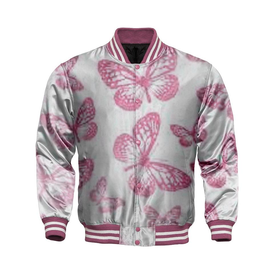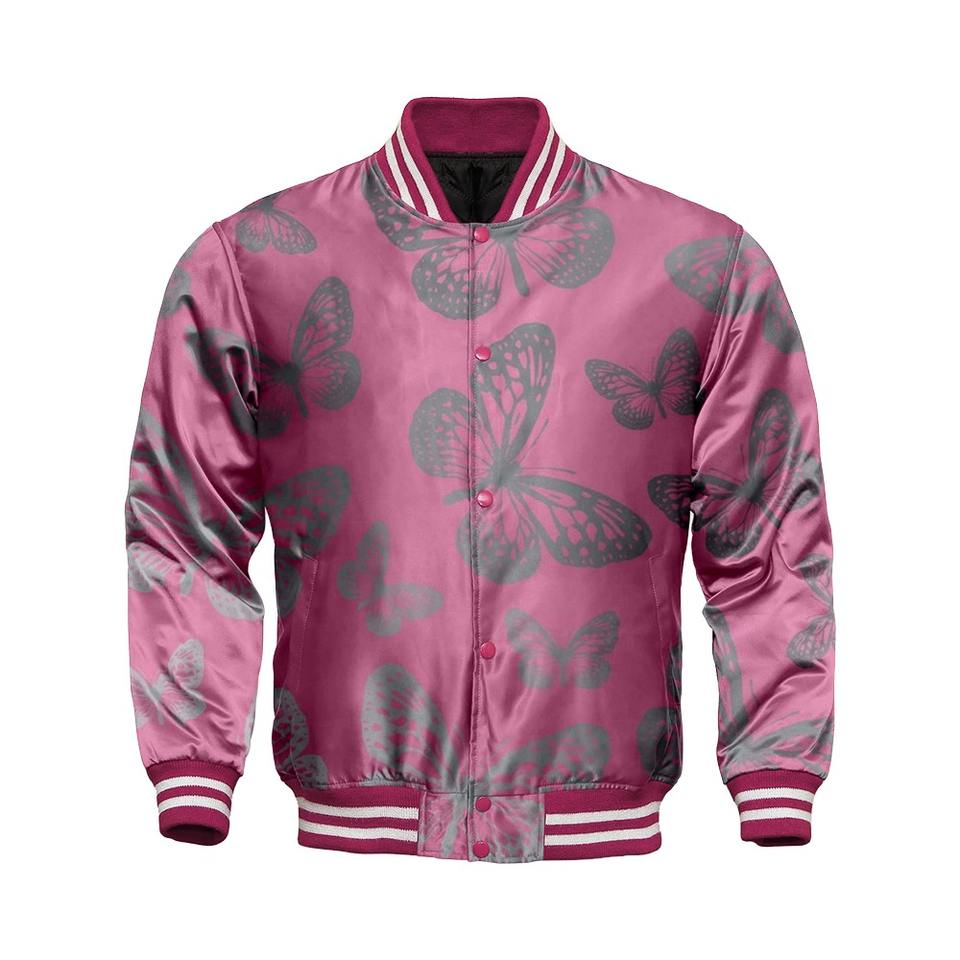 แจ็กเก็ตเบสบอลผ้าซาตินปักลายมหาวิทยาลัยมีคอตั้งเสื้อแจ็คเก็ตบอมเบอร์ดีไซน์แบบกลับด้านได้