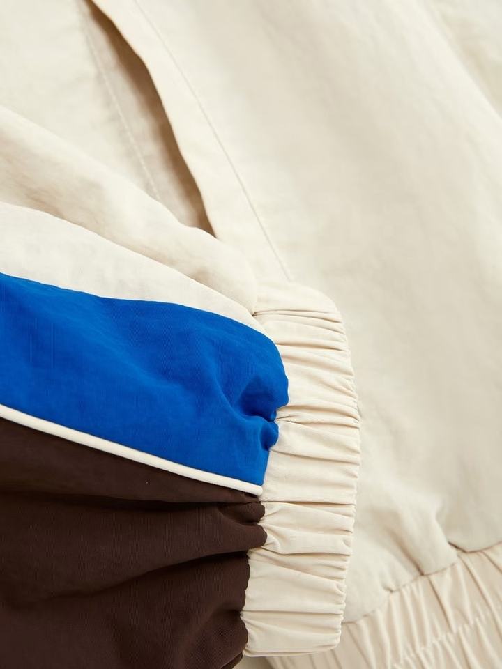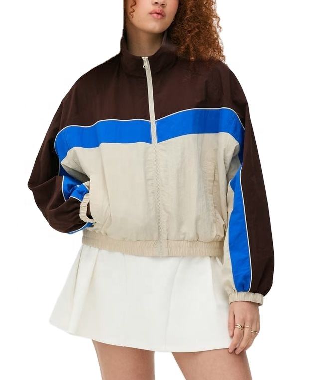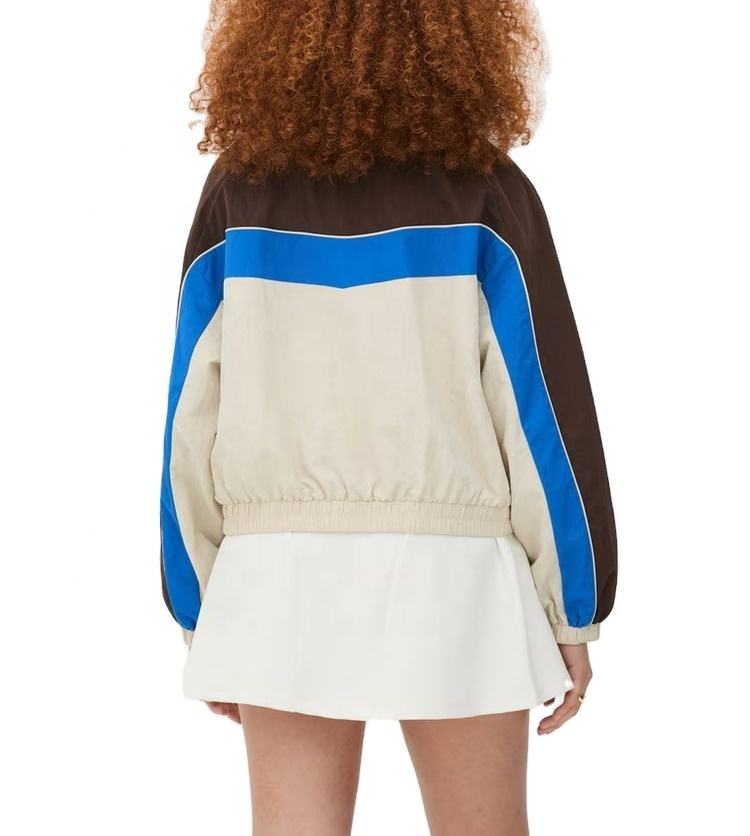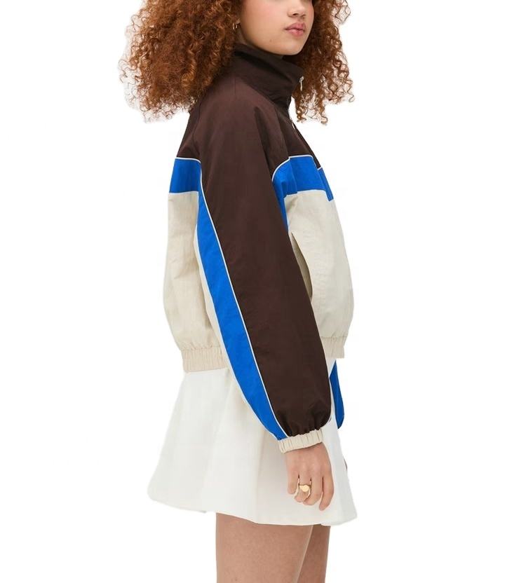 เสื้อแจ็คเก็ตกันลมแบบมีฮู้ดสำหรับผู้หญิง สีสันแบบคัสตอม ระบายอากาศได้ดี ตัดต่อสีสันแบบแพทช์เวิร์ค เหมาะสำหรับกิจกรรมกลางแจ้ง ผลิตจากไนลอนกันน้ำ