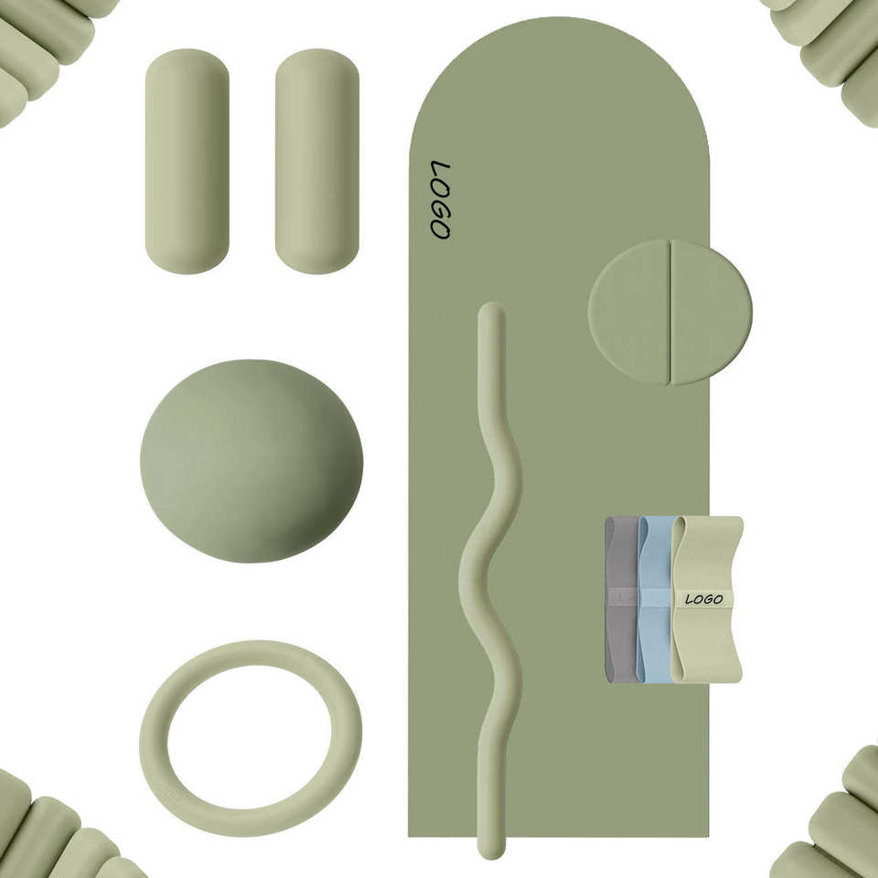 ชุดอุปกรณ์ออกกำลังกายที่บ้านพร้อมโลโก้สีตามสั่ง ประกอบด้วยอุปกรณ์โยคะ พิลาทิส บาร์เบล บาร์ ดัมเบลซิลิโคน วงแหวนออกกำลังกาย และเสื่อโยคะ