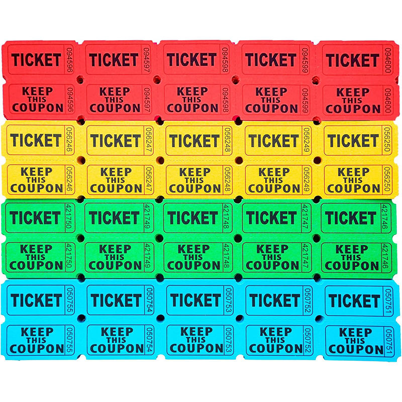 สีที่กำหนดเองฉีกออกตั๋วการจับฉลากเข้าแบบมีรูเลขติดต่อกัน400ชิ้นตั๋วจับฉลากแบบม้วนคู่