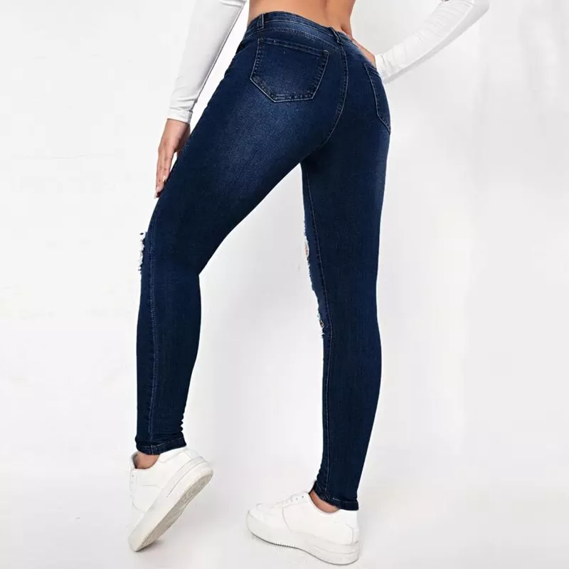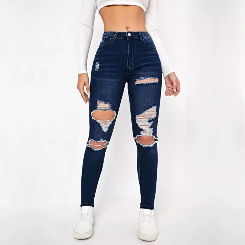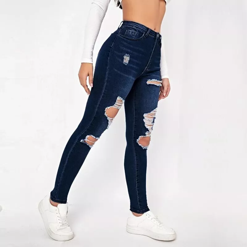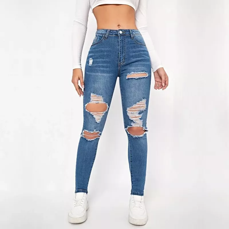 กางเกงยีนส์ผ้ายืดเอวสูงสำหรับผู้หญิง,กางเกงยีนส์เอวสูงมีรอยขาดแบบสั่งทำ