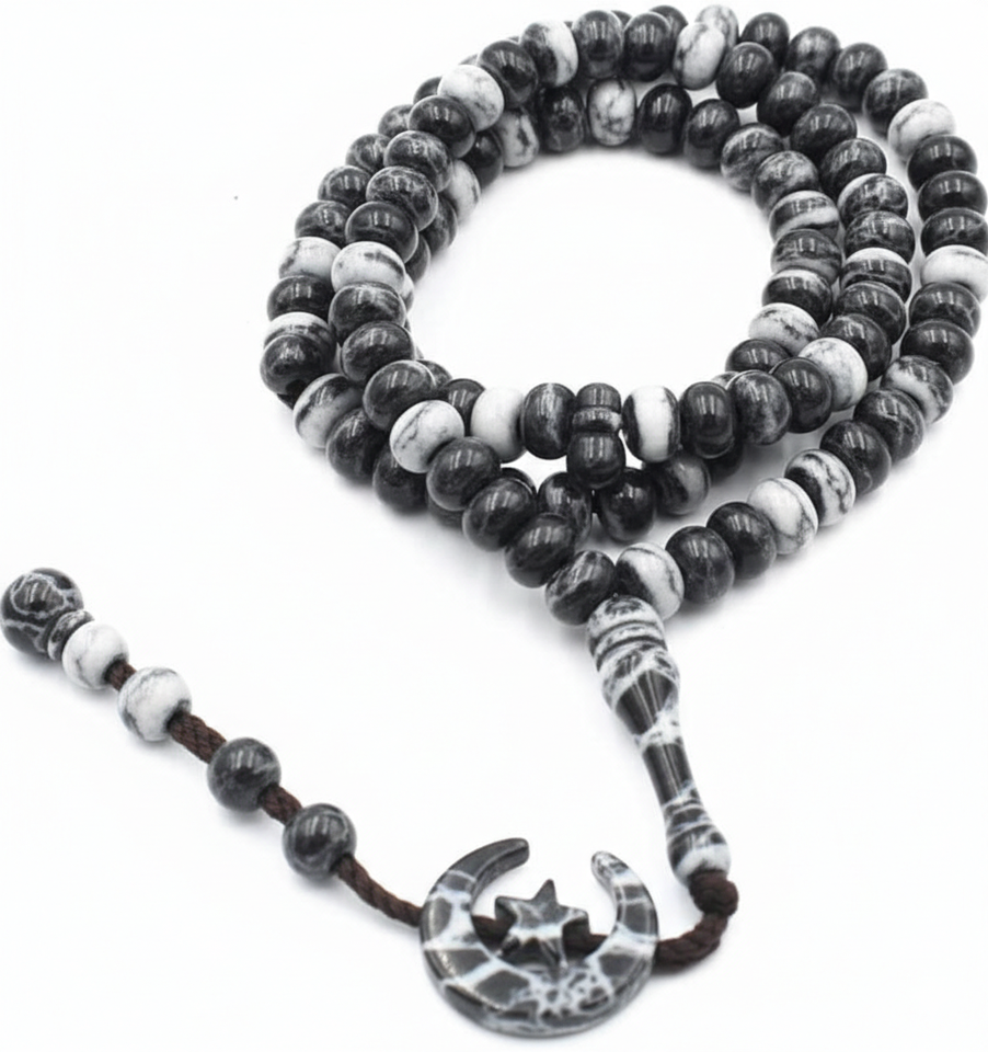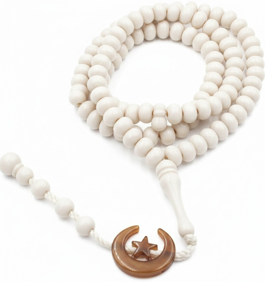 ลูกประคำทรงกลมสีขาวทองแบบกำหนดเอง ลูกปัดประคำอิสลาม 99/33 เม็ด พู่ห้อยรูปพระจันทร์และดวงดาว งานแฮนด์เมดสุดหรู
