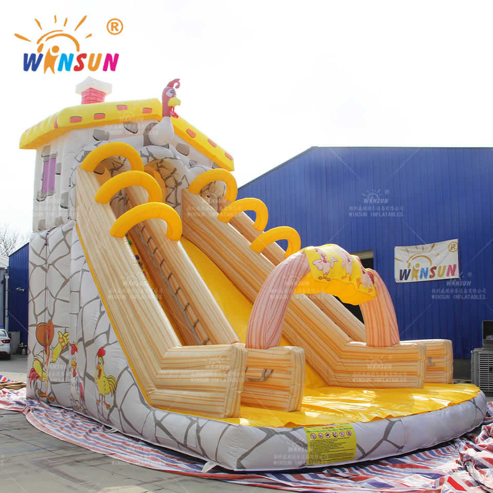 สไลด์น้ำแบบเป่าลมรูปไก่มีสไลเดอร์แห้งสีฟ้าและสีขาวสำหรับใช้กลางแจ้งในเชิงพาณิชย์งานตามสั่ง
