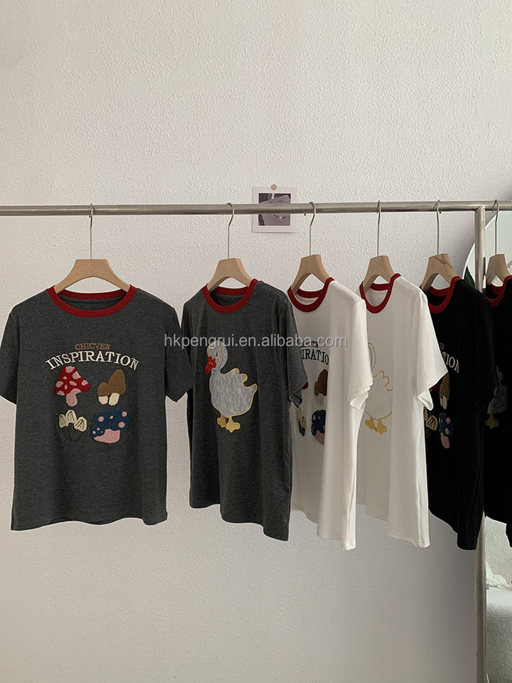 เสื้อยืดผู้หญิงคอกลมแขนสั้นลายเป็ดลูกไม้สีตัดกันแบบกำหนดเอง