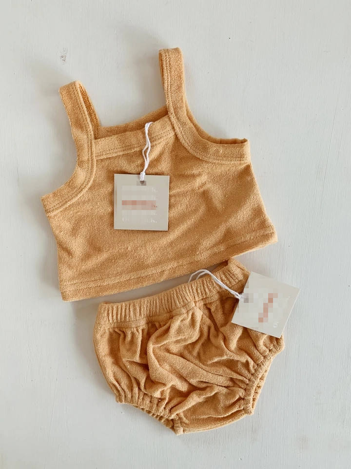 ชุดเสื้อกั๊กเด็กผู้หญิงผ้าเทอร์รี่เนื้อนุ่มแบบไม่มีแขน พร้อมกางเกงบลูมเมอร์ผ้าฝ้าย ชุดเซ็ต 2 ชิ้น สำหรับฤดูร้อน ดีไซน์เก๋ไก๋