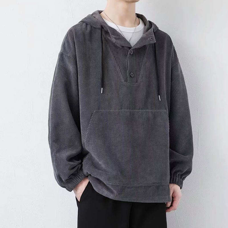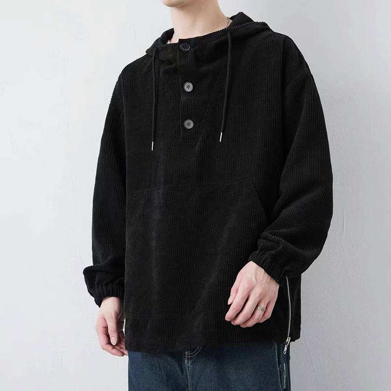 เสื้อฮู้ดคอร์ดูรอยผู้ชายสไตล์ฮิปฮอป ติดกระดุม มีกระเป๋าขนาดใหญ่พิเศษ