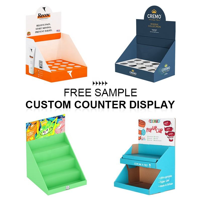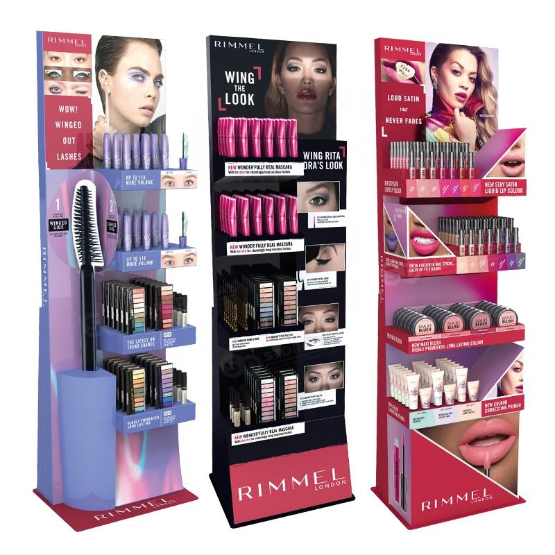 ชั้นวางเครื่องสำอางแบบตั้งโต๊ะทำจากกระดาษแข็งพร้อมช่องแบ่งและหัวข้อสำหรับจัดแสดงสินค้าปลีก กล่องโชว์เครื่องสำอางทำจากกระดาษลูกฟูก