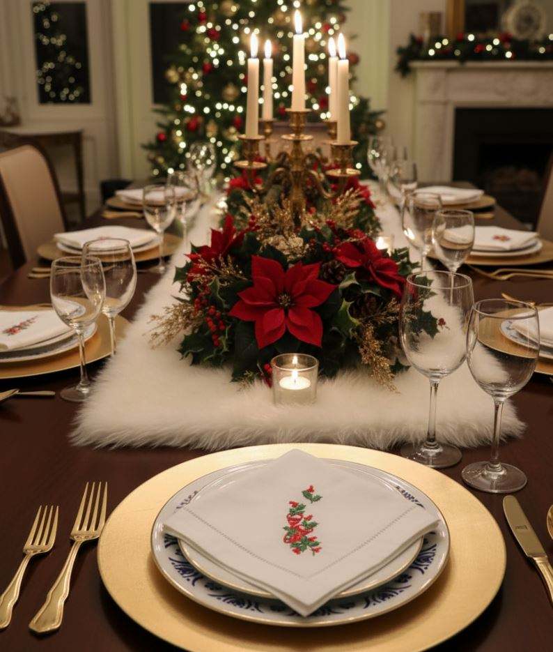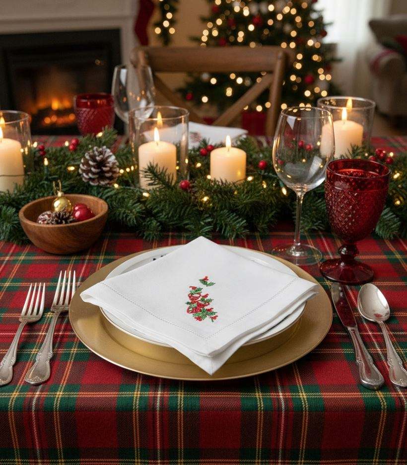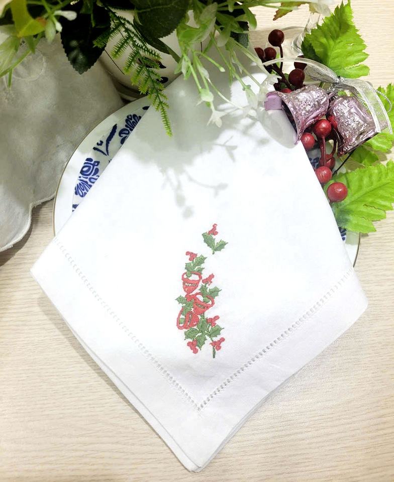 ผ้าเช็ดปากผ้าฝ้ายปักลายกระดิ่งสีแดงและผ้าเช็ดปากบนโต๊ะแบบฮอลลี่สำหรับดินเนอร์คริสต์มาส