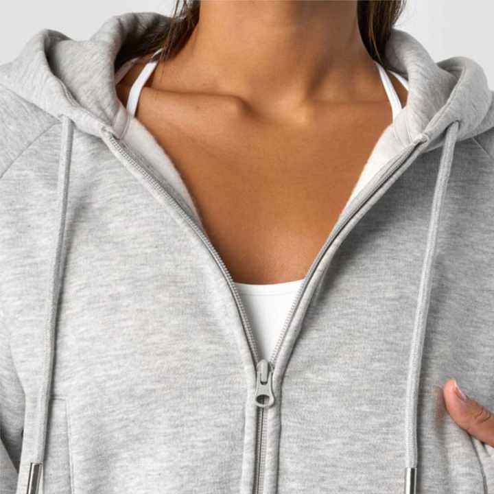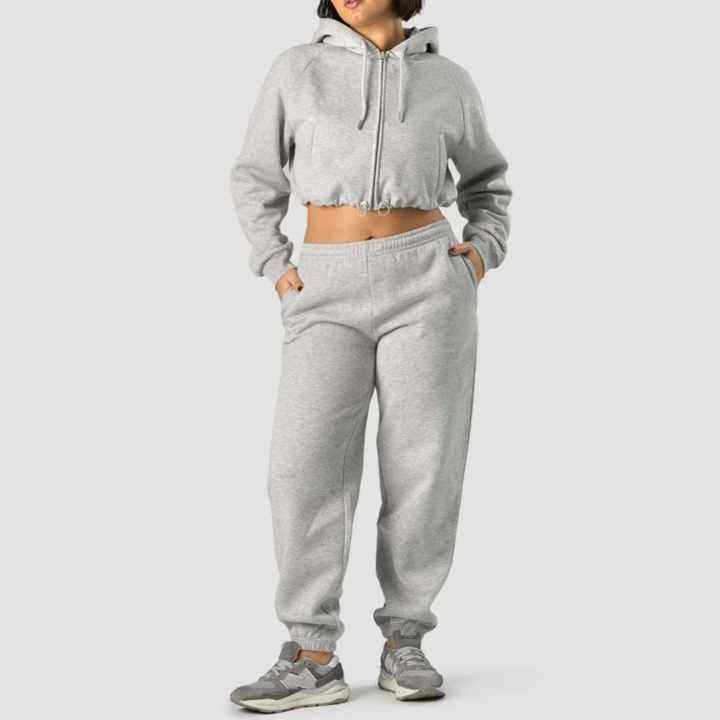 ชุดวอร์มผ้าฟลีซผสมคอตตอนโพลีเอสเตอร์แบบสองชิ้นสำหรับผู้หญิง เสื้อแจ็คเก็ตซิปแบบครอป ฮู้ดดี้ และกางเกงจ็อกเกอร์