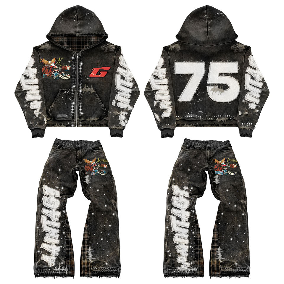ชุดเซ็ตเสื้อฮู้ดดี้และกางเกงวอร์มผ้าฝ้ายปักลายคริสตัลแบบซิป สไตล์ย้อมสีซีดแบบซันเฟด พิมพ์ลายสกรีน สำหรับผู้ชาย