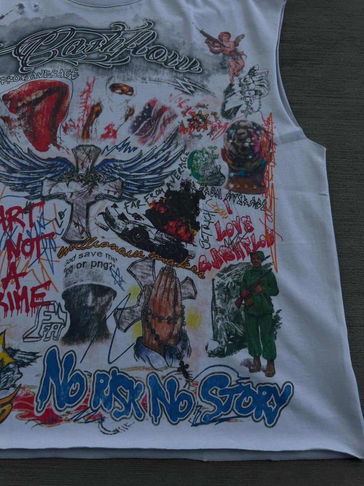 เสื้อกล้ามผ้าฝ้ายวินเทจสไตล์ทำสีซีดแบบย้อมกรด พิมพ์ลาย DTG ทรงโอเวอร์ไซส์ สตรีทแวร์ เสื้อยืดแขนกุด
