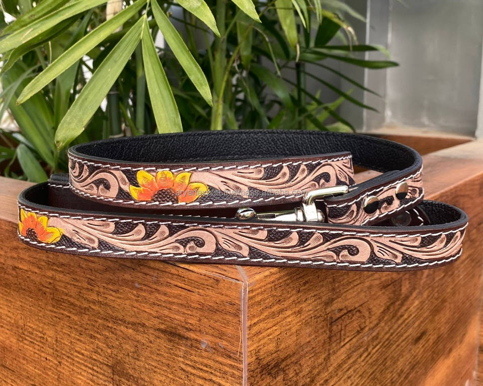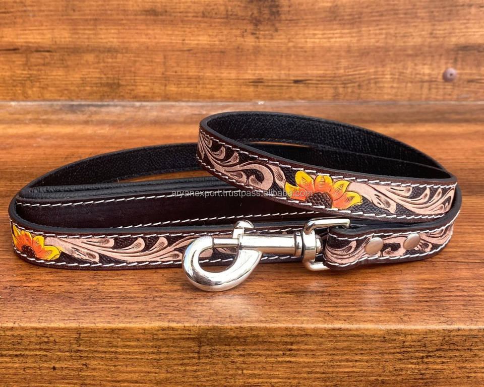 สายจูงสุนัขหนังวัวสำหรับฝึกสุนัขทำมือเชือกหนังลายดอกไม้สุดหรูสายจูงสุนัขขนาดกลางขนาดใหญ่สำหรับจูงสุนัขเดินเล่น