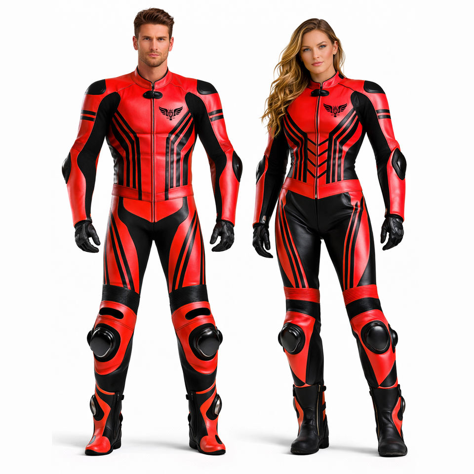 ชุดขับขี่มอเตอร์ไซค์แบบเต็มตัว สีแดงเข้มดำ หนังป้องกันสำหรับนักแข่งรถบนสนามแข่งและนักขับขี่สมรรถนะสูง (สำหรับผู้ชายและผู้หญิง)