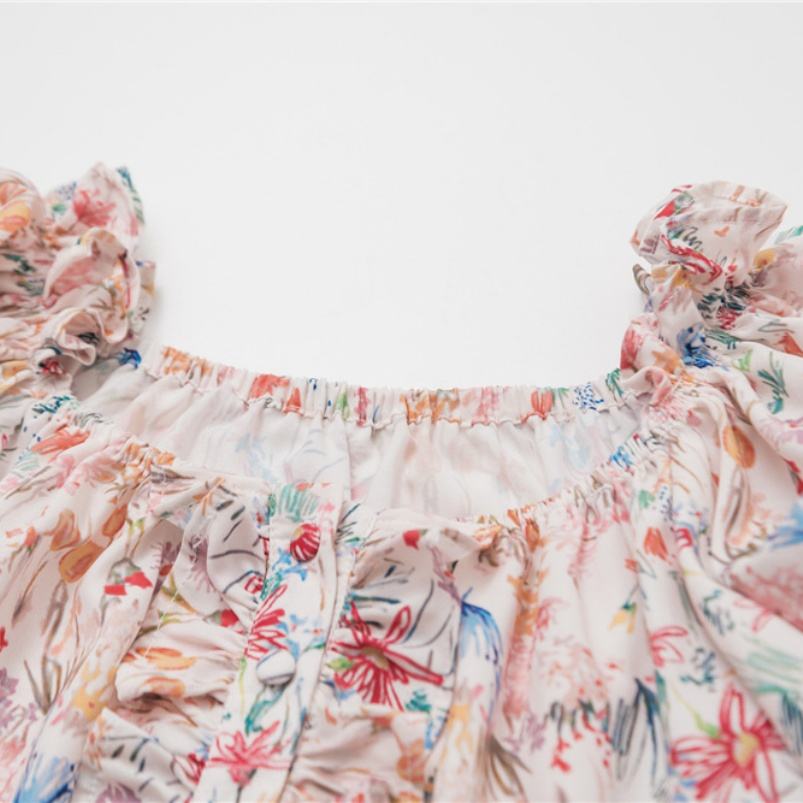 เสื้อครอปเปิดไหล่แขนสั้นพิมพ์ลายดอกไม้แต่งระบายสำหรับผู้หญิง