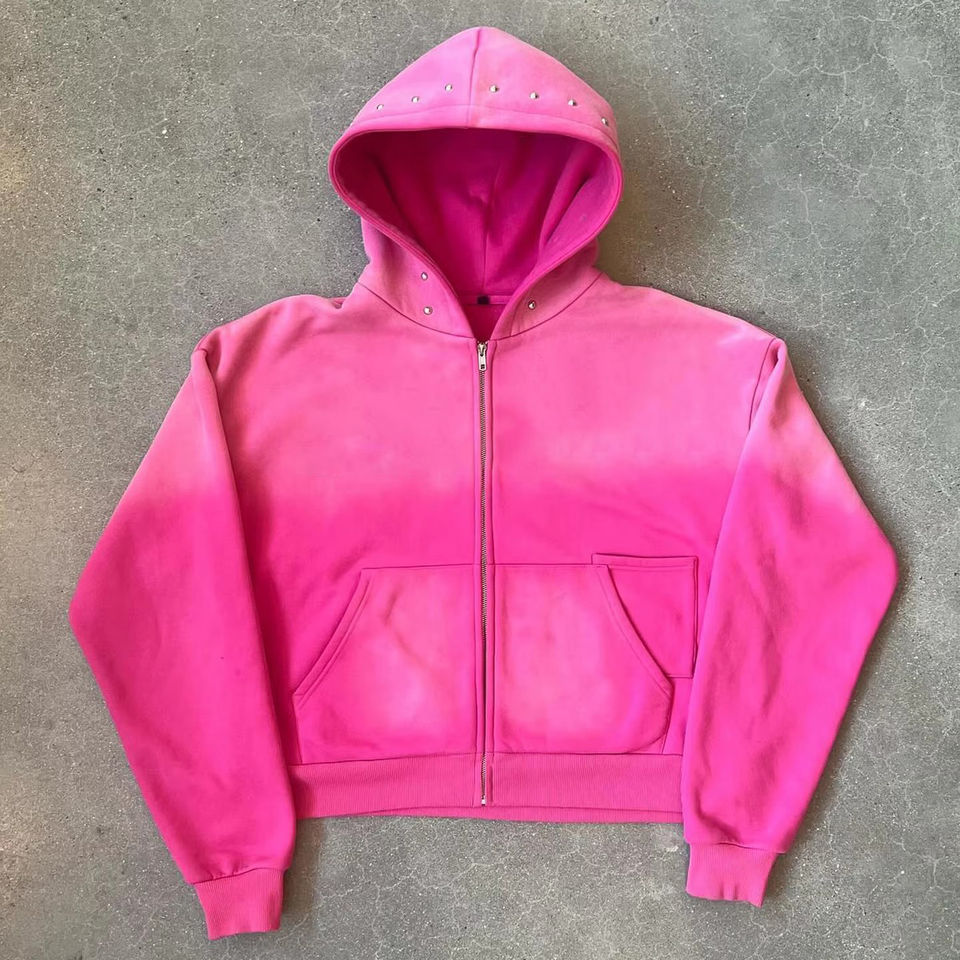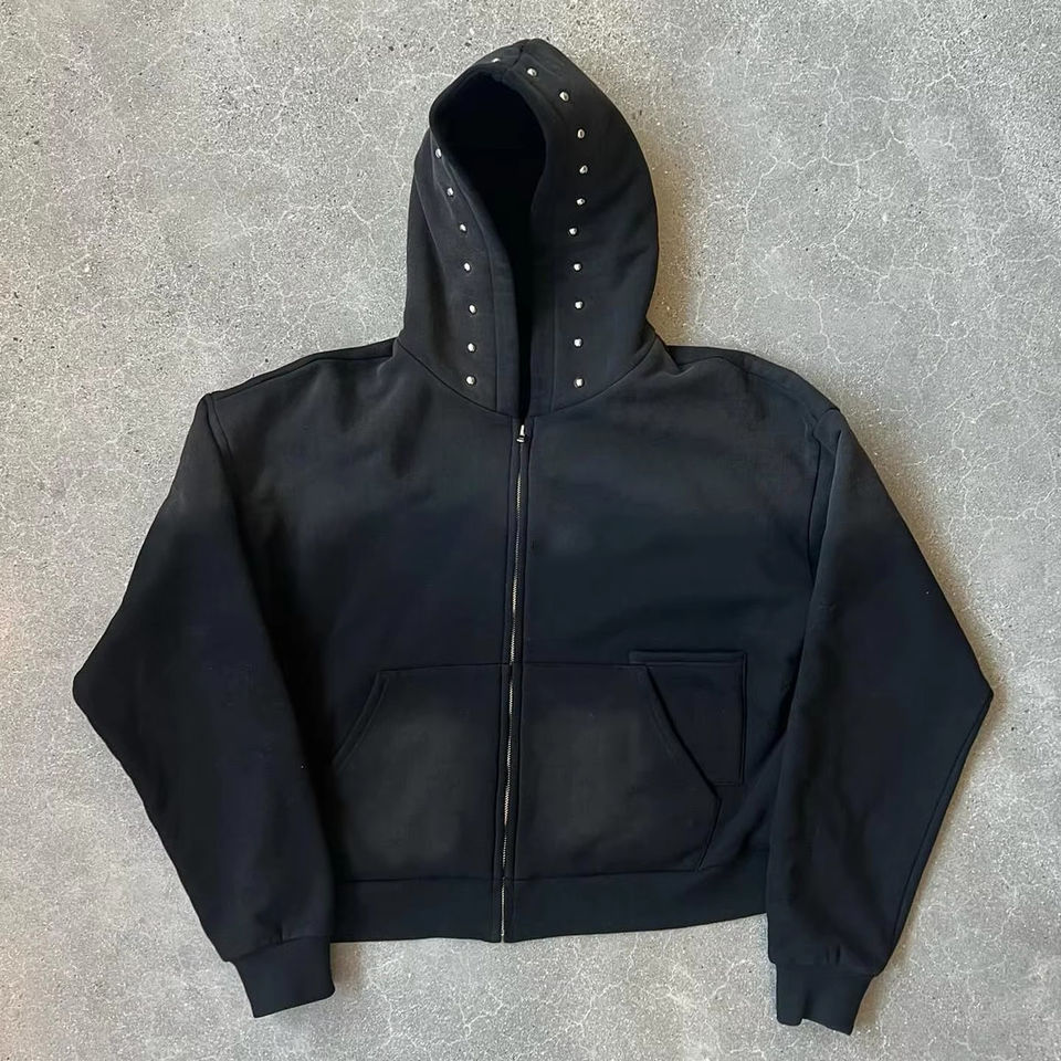 เสื้อแจ็คเก็ตซิปทรงบ็อกซี่แบบครอปสั่งทำพิเศษ ผ้าหนา 500gsm สไตล์ซันเฟด สำหรับผู้ชาย เสื้อผ้าฤดูหนาว ตกแต่งด้วยคริสตัล ล้างสีแบบแอซิดวอช