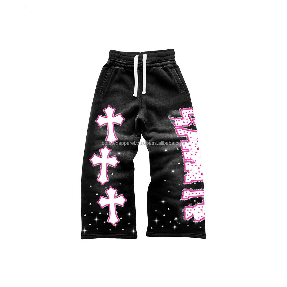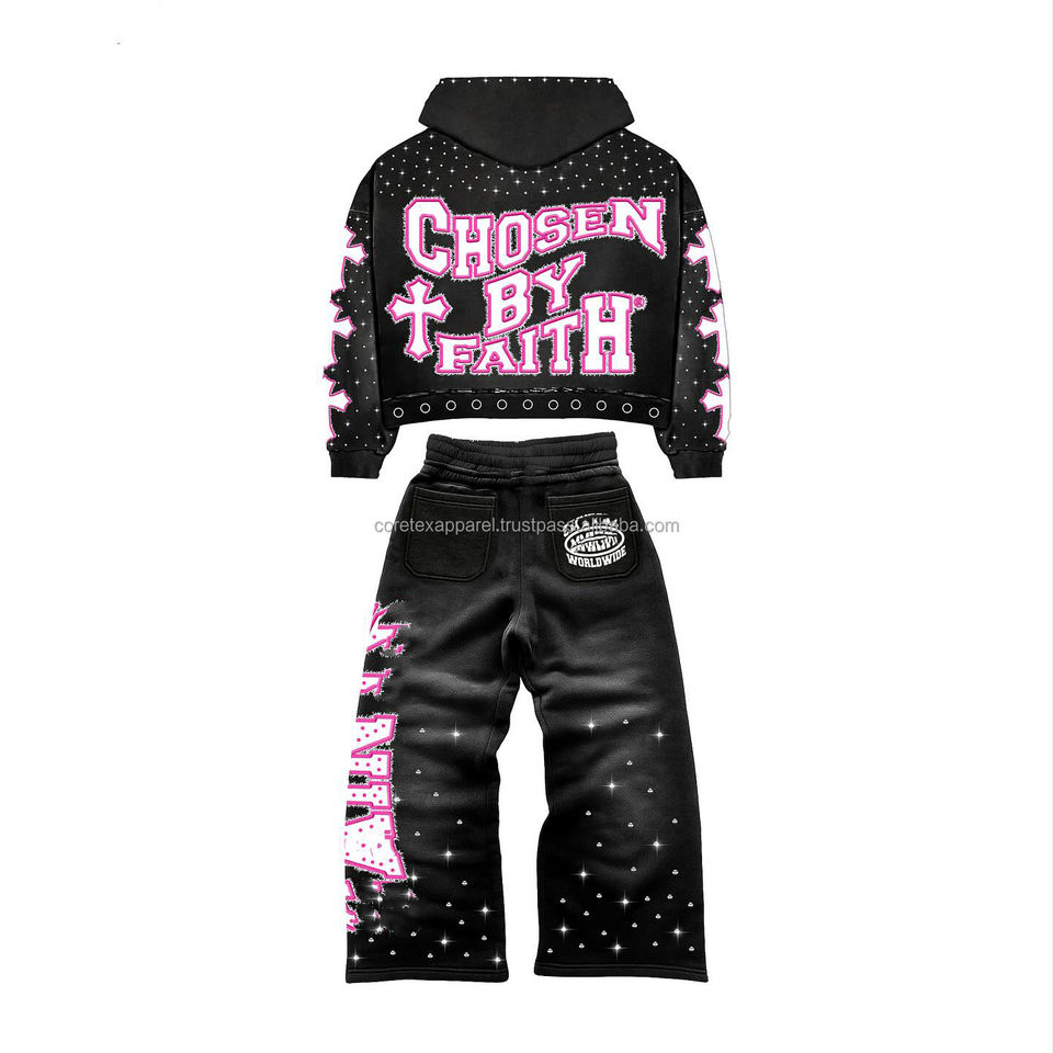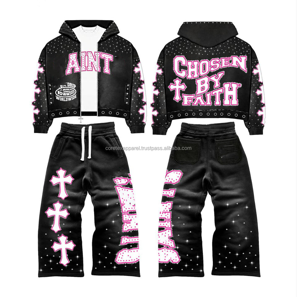 ชุดเซ็ตสเวตสูทแบบซิปแต่งครอปสไตล์ดิสเทรส ประดับคริสตัล สตรีทแวร์ ทรงแบ็กกี้ กางเกงขาบานและเสื้อฮู้ด